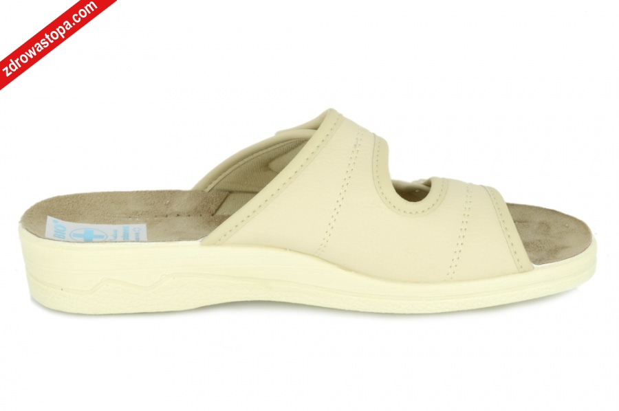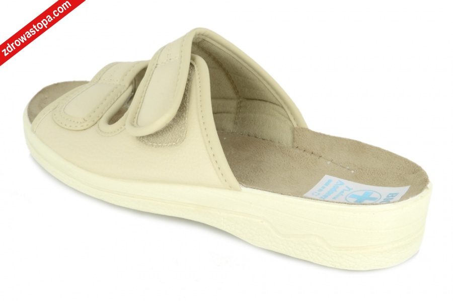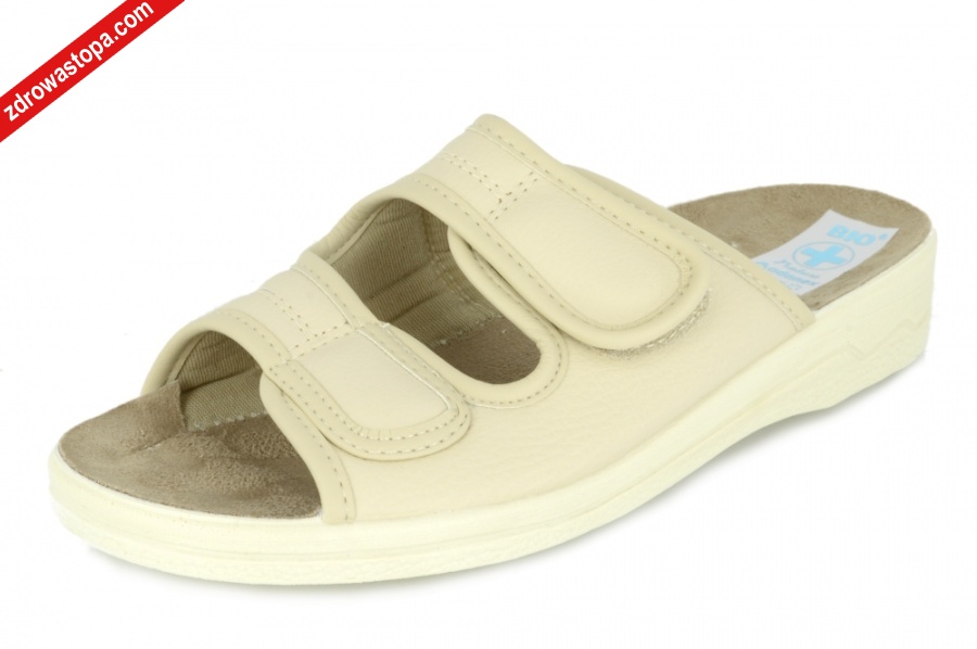 Typ: klapki damskie Kolor: beżowy Materiał wierzchni: materiał skóropodobny Wnętrze buta: miękki materiał tekstylny Dodatkowe informacje: Komfortowe kapcie typu Bio, odkryte palce, dobre dopasowanie do podbicia zapewnia zapięcie na rzepę. Bardzo lekkie i elastyczne obuwie.