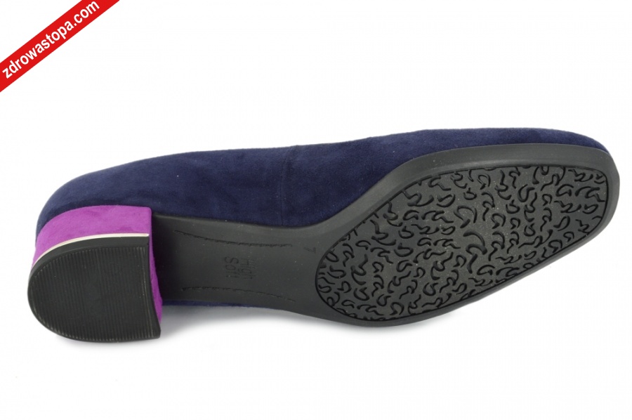 Typ: czółenko Kolor: granatowy Materiał wierzchni: naturalna skóra zamszowa Wnętrze buta: skóra naturalna Dodatkowe informacje: Czółenko dookoła wykończone jest taśmą, która niweluje sztywność w podbiciu. Wykonane z miękkiej skóry zamszowej, skórzana wkładka HIGH SOFT, podeszwy elastyczne i antypoślizgowe. Wysokość obcasa 35 mm