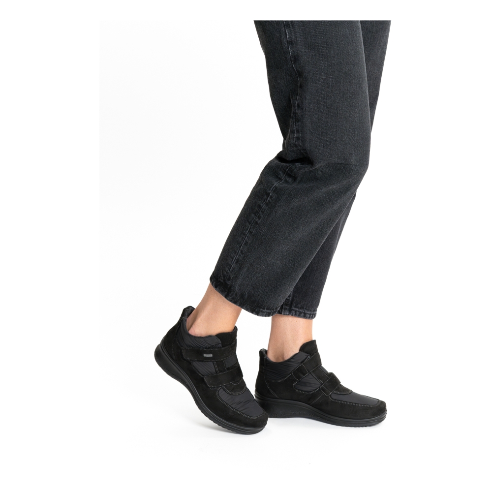 Typ: botki damskie Kolor: czarny Materiał wierzchni: ortalion i materiał z GORE-TEX Wnętrze buta: wełna syntetyczna Dodatkowe informacje: