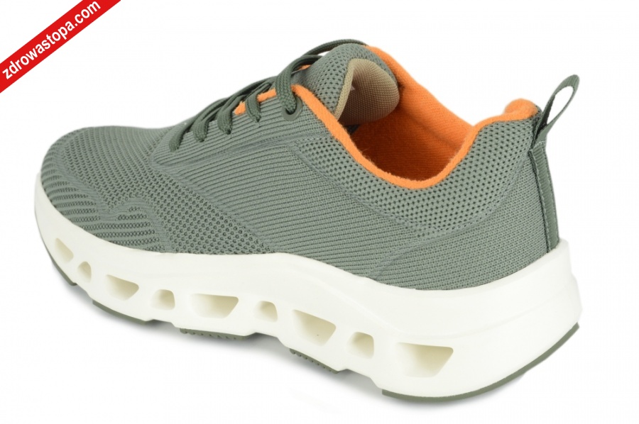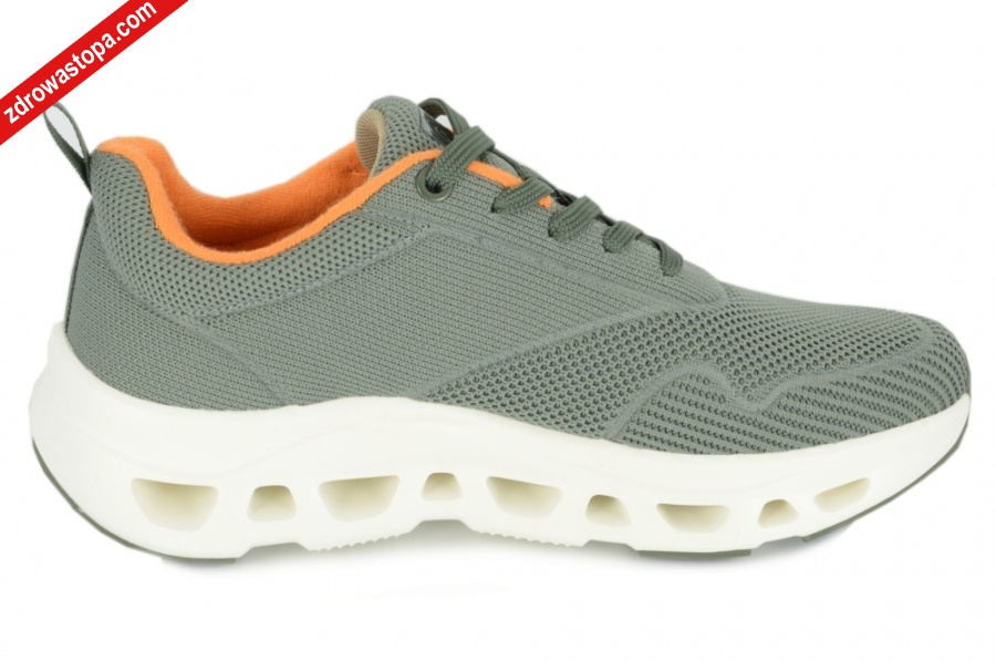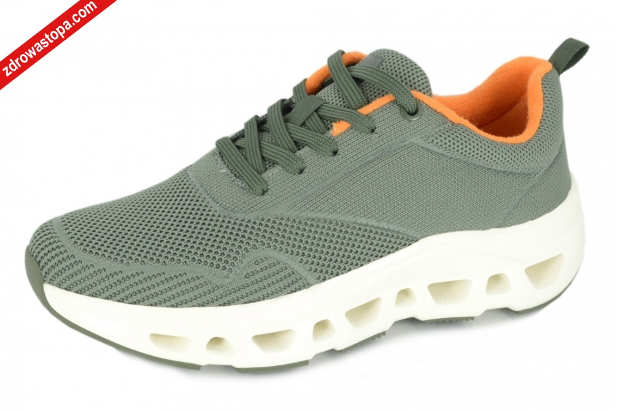 Typ: półbuty damskie Kolor: zielony – thyme Materiał wierzchni: elastyczna siateczka Wnętrze buta: materiał obuwniczy Tęgość: H Dodatkowe informacje: Obuwie wykonane z elastycznej i przewiewnej siateczki, sznurowane. Spody lekkie i antypoślizgowe. Wyjmowana miękka wkładka pozwala na zastąpienie jej własną np: ortopedyczną. Wysokość podwyższenia pod piętą 45mm.