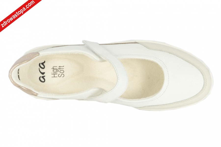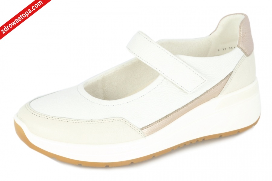 Typ: półbuty damskie Kolor: biały – cream weiss Materiał wierzchni: skóra naturalna Wnętrze buta: miękki materiał na bazie włókien babusowej Tęgość: H Dodatkowe informacje: Obuwie wykonane z bardzo miękkiej skóry naturalnej, zapinane na rzepę. Spody lekkie i antypoślizgowe. Wyjmowana miękka wkładka pozwala na zastąpienie jej własną np: ortopedyczną. Wyściółka z włókien bambusowych jest przyjazna dla skóry stopy, dobrze przepuszcza powietrze. Wysokość podwyższenia pod piętą 35mm.