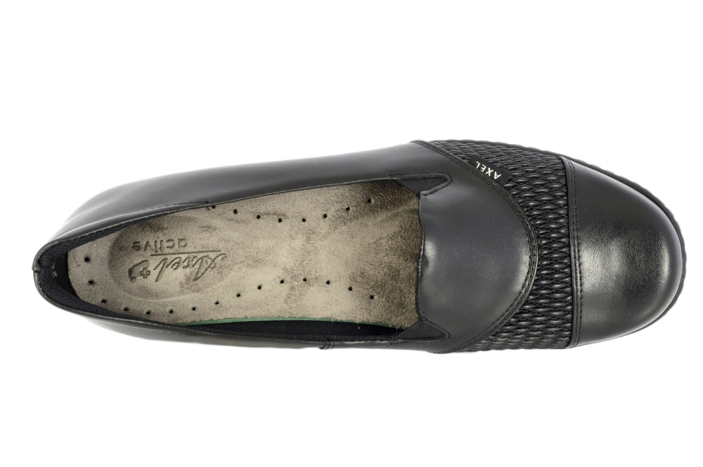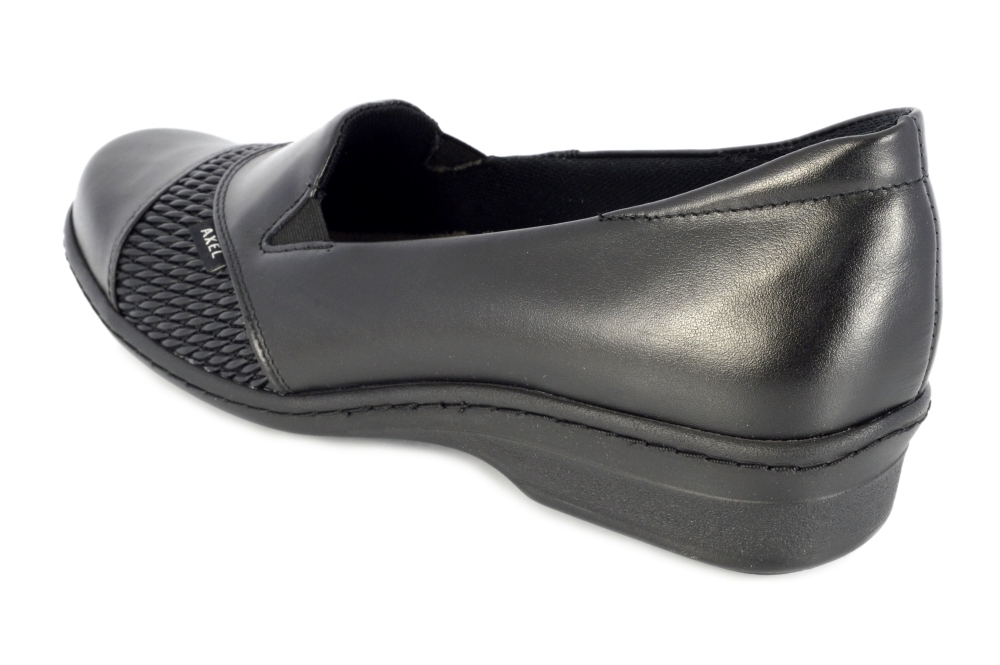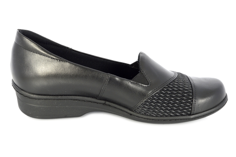 Typ: półbuty damskie Kolor: czarny Materiał wierzchni: skóra naturalna i elastyczny materiał Wnętrze buta: materiał obuwniczy + wyjmowana wkładka Dodatkowe informacje: Obuwie wsuwane wykonane z miękkiej skóry naturalnej lico. Spód szeroki antypoślizgowy. Wyjmowana profilowana wkładka którą można zastąpić na swoją.