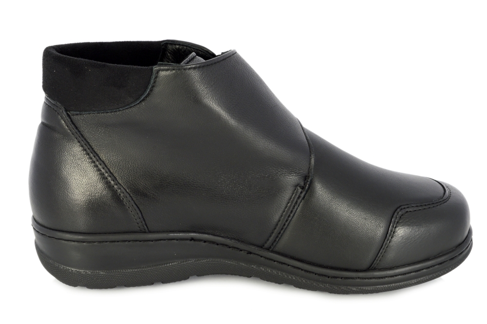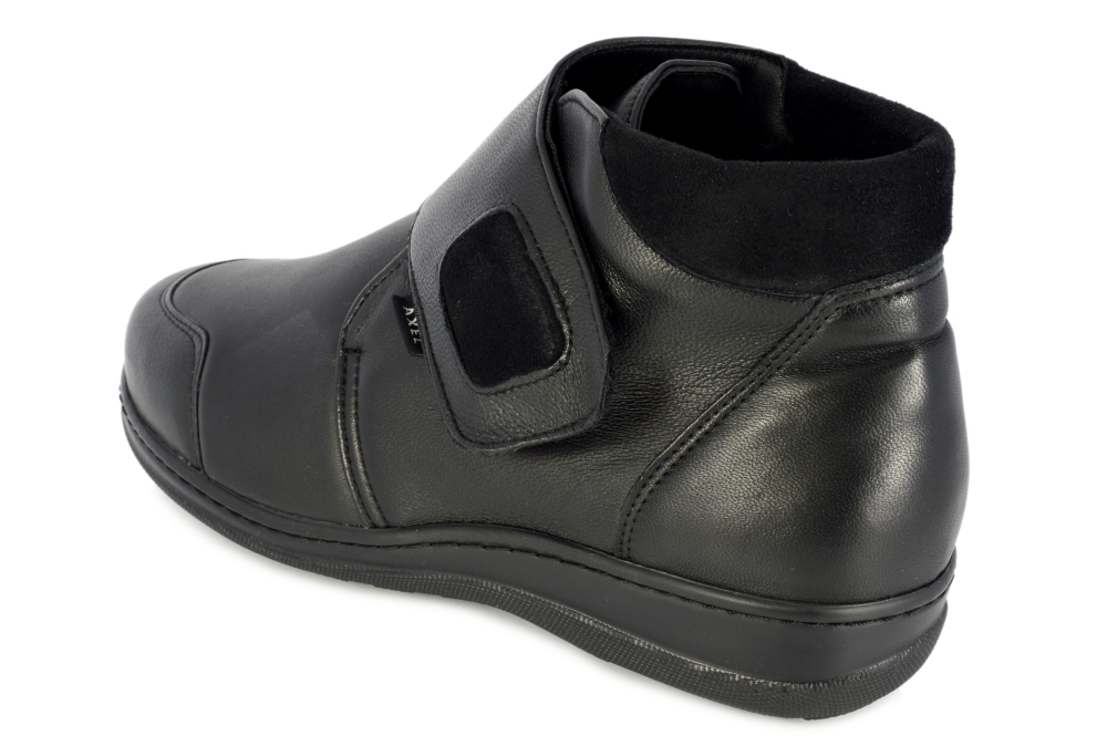 Typ: botki damskie Kolor: czarny Materiał wierzchni: skóra naturalna Wnętrze buta: materiał obuwniczy Dodatkowe informacje: Obuwie zapinane na szeroką rzepę, wykonane z miękkiej skóry naturalnej lico. Spód szeroki antypoślizgowy, bardzo lekkie.