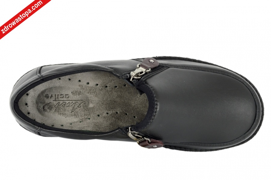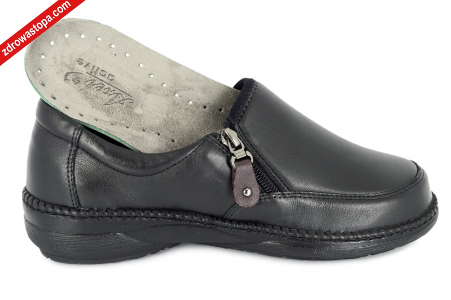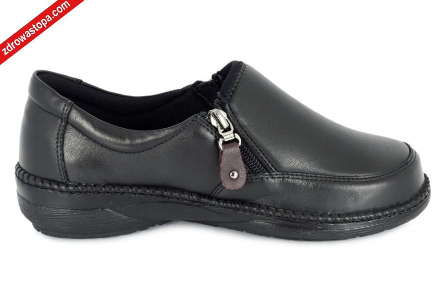Typ: półbuty damskie Kolor: czarny Materiał wierzchni: skóra naturalna + strech Wnętrze buta: materiał obuwniczy + wyjmowana wkładka Dodatkowe informacje: Obuwie wsuwane wykonane z miękkiej skóry naturalnej lico, przednia część strechowa dopasowuję się do stopy dwa suwaki ułatwiają zakładanie osobom z wysokim podbiciem. Spód szeroki antypoślizgowy. Wyjmowana profilowana wkładka którą można zastąpić na swoją.