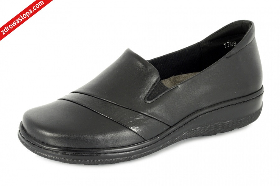 Typ: półbuty damskie Kolor: czarny Materiał wierzchni: skóra naturalna Wnętrze buta: materiał obuwniczy + wyjmowana wkładka Dodatkowe informacje: Obuwie wsuwane wykonane z miękkiej skóry naturalnej lico. Spód szeroki antypoślizgowy. Wyjmowana profilowana wkładka którą można zastąpić na swoją.