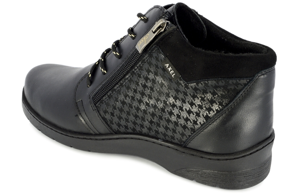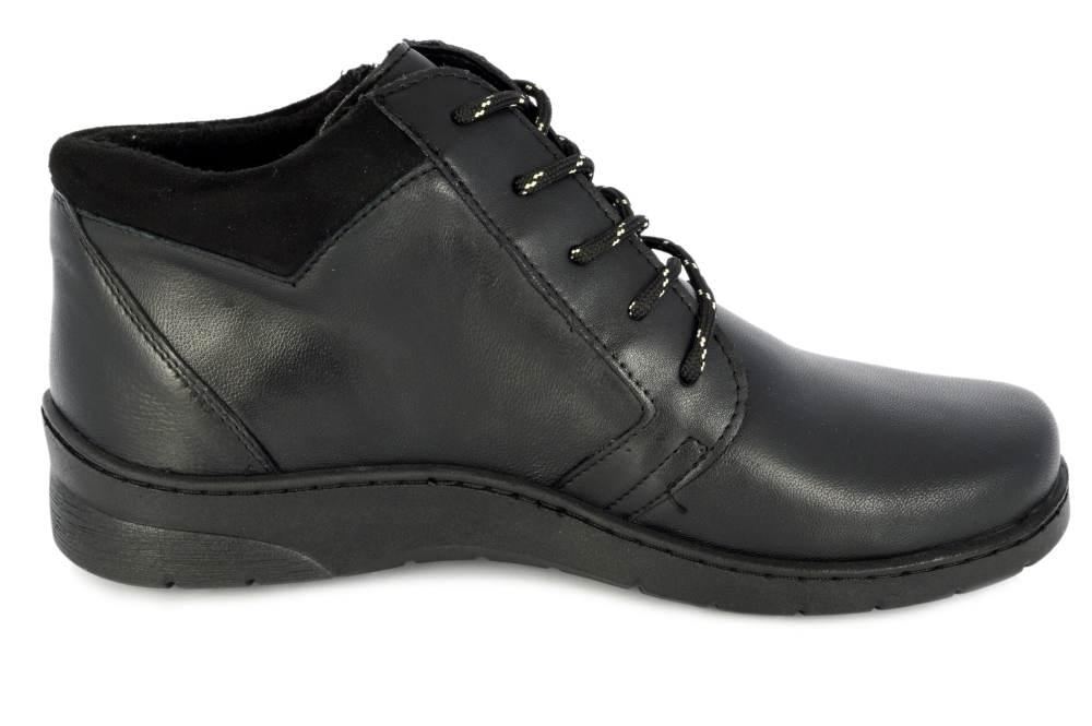 Typ: botki damskie Kolor: czarny Materiał wierzchni: skóra naturalna Wnętrze buta: materiał obuwniczy Dodatkowe informacje: Obuwie sznurowane wykonane z miękkiej skóry naturalnej lico, suwak z boku ułatwia zakładanie. Spód szeroki antypoślizgowy, bardzo lekkie.
