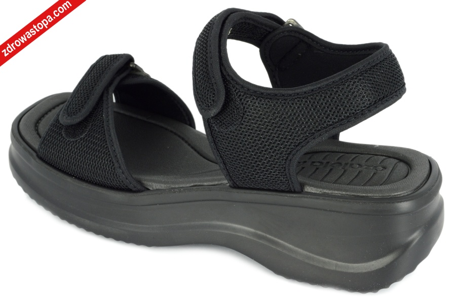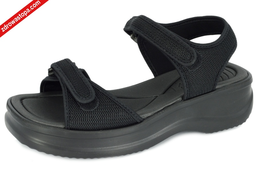 Typ: sandały damskie tekstylne Kolor: czarny Materiał wierzchni/Wnętrze buta: naturalny materiał tekstylny Dodatkowe informacje: wysokość klinu 45 mm, bardzo lekkie wykonane z naturalnych materiałów spody, sandały zapinane na dwie rzepy.