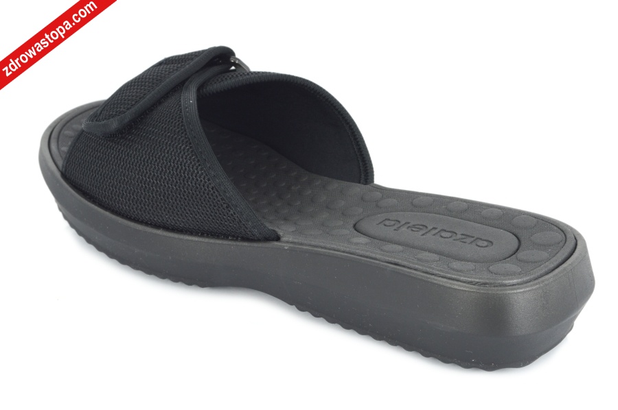 Typ: klapki damskie tekstylne Kolor: czarny Materiał wierzchni/Wnętrze buta: naturalny materiał tekstylny Dodatkowe informacje: wysokość klinu 35 mm, spody bardzo lekkie, obuwie wykonane z naturalnych materiałów, klapki regulowane na rzepę.