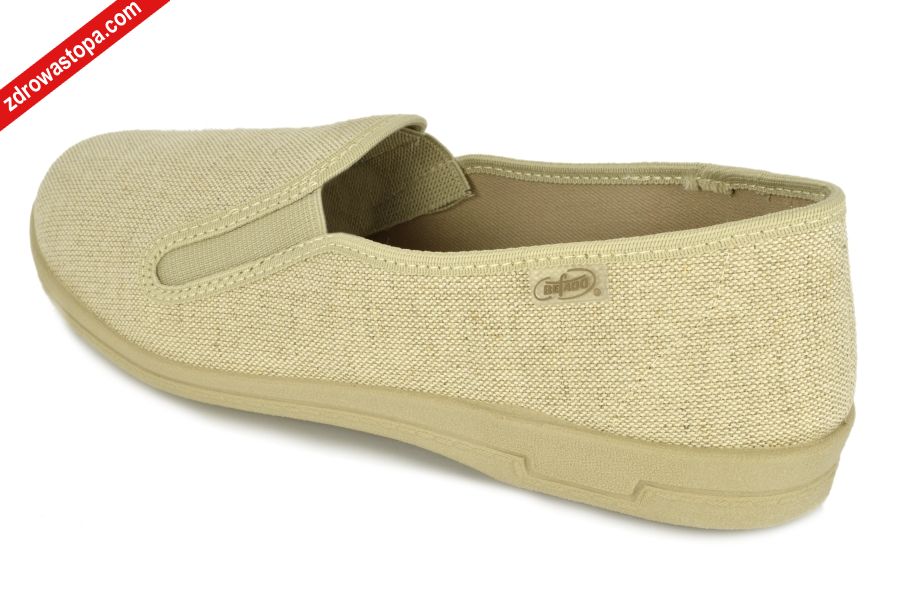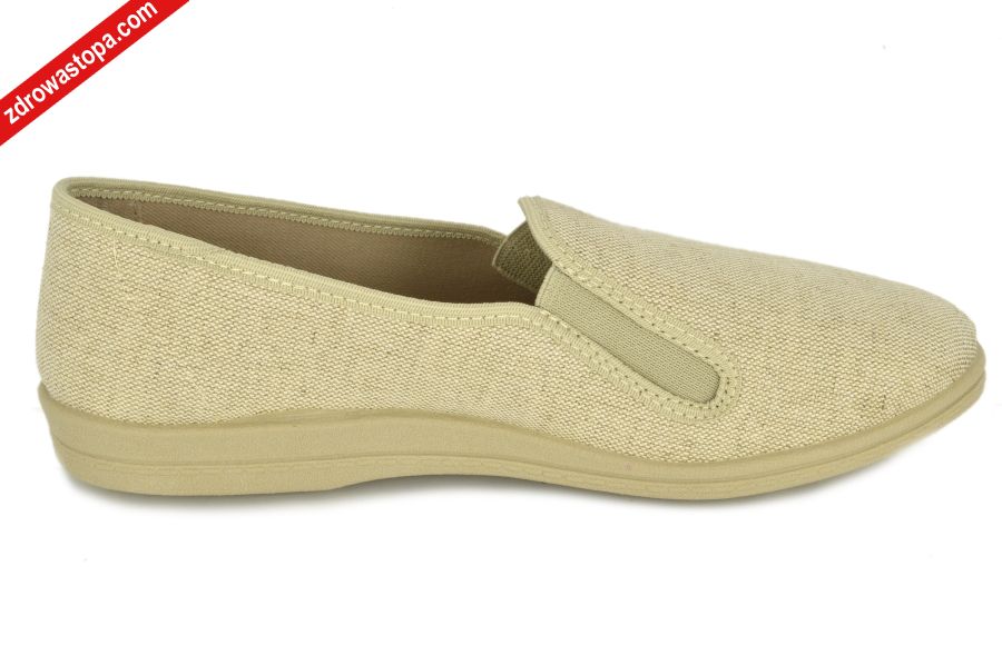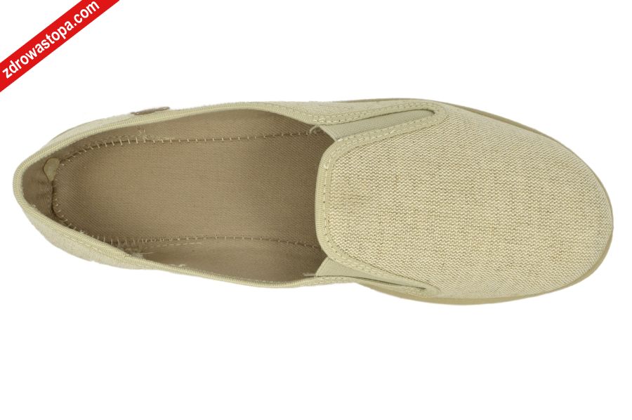 Typ: obuwie męskie tekstylne Kolor: beżowy – len Materiał wierzchni: materiał włókienniczy (płótno) Wnętrze buta: materiał włókienniczy (płótno) Dodatkowe informacje: w podbiciu regulowane na dwie gumki, wykonane z oddychającego materiału