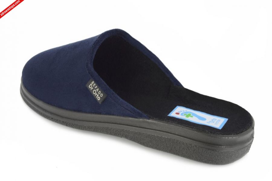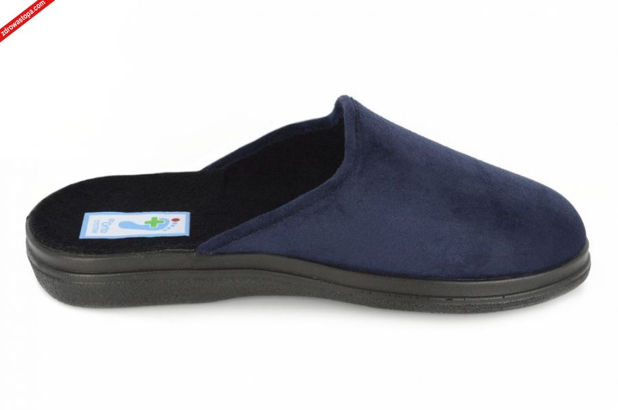 Typ: klapki męskie Kolor: granatowy Materiał wierzchni: materiał tekstylny Wnętrze buta: naturalny materiał Dodatkowe informacje: Klasyczna kolorystyka, łatwa wzuwalność , wysokiej jakości materiały zapewniające stopom odpowiednią cyrkulację powietrza spełnią oczekiwania najbardziej wymagających odbiorców. Minimalna ilość przeszyć i łączeń, lekka sprężysta podeszwa z pianki poliuretanowej pochłania mikro-wstrząsy, mogą być stosowane przez osoby z tzw. „zespołem stopy cukrzycowej”.