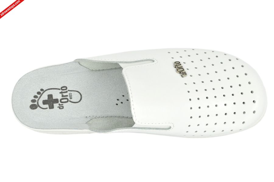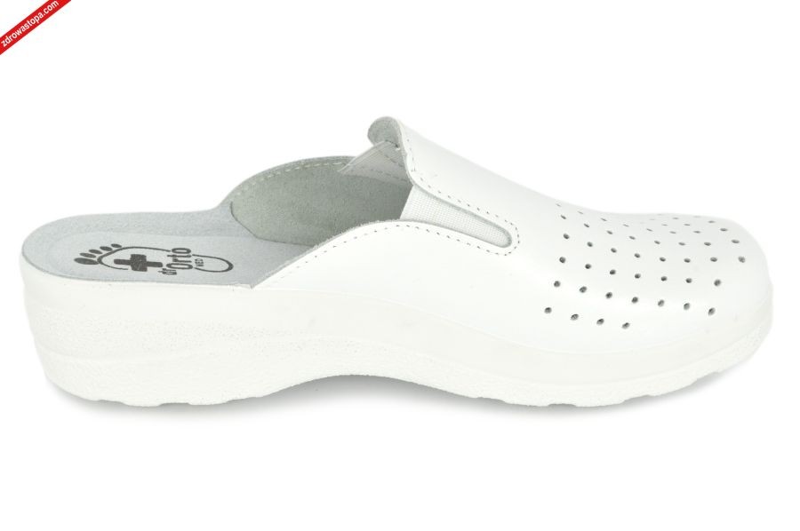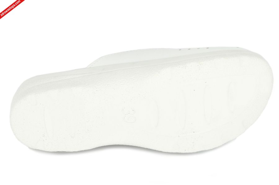 Typ: klapki damskie Kolor: biały Materiał wierzchni: skóra ekologiczna Wnętrze buta: wkładka ze skóry naturalnej Tęgość: H Dodatkowe informacje: klapki damskie z gumkami na podbiciu dopasowujące się do stopy, zakryte palce, dzięki skórzanej wkładce i dziurkom w przedniej części stopa się nie poci, wysokość klinu: 30 mm