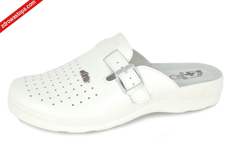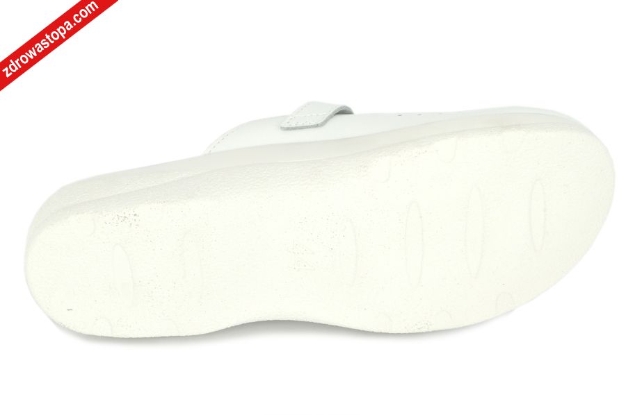 Typ: klapki męskie Kolor: biały Materiał wierzchni: skóra ekologiczna Wnętrze buta: wkładka ze skóry naturalnej Tęgość: H Dodatkowe informacje: pasek z klamerką na podbiciu pozwala na idealne dopasowanie do stopy, zakryte palce, dzięki skórzanej wkładce i dziurkom w przedniej części stopa się nie poci, wysokość klinu: 30 mm. Spody wykonane z miękkiego tworzywa sztucznego, dobrze amortyzuje mikro wstrząsy.