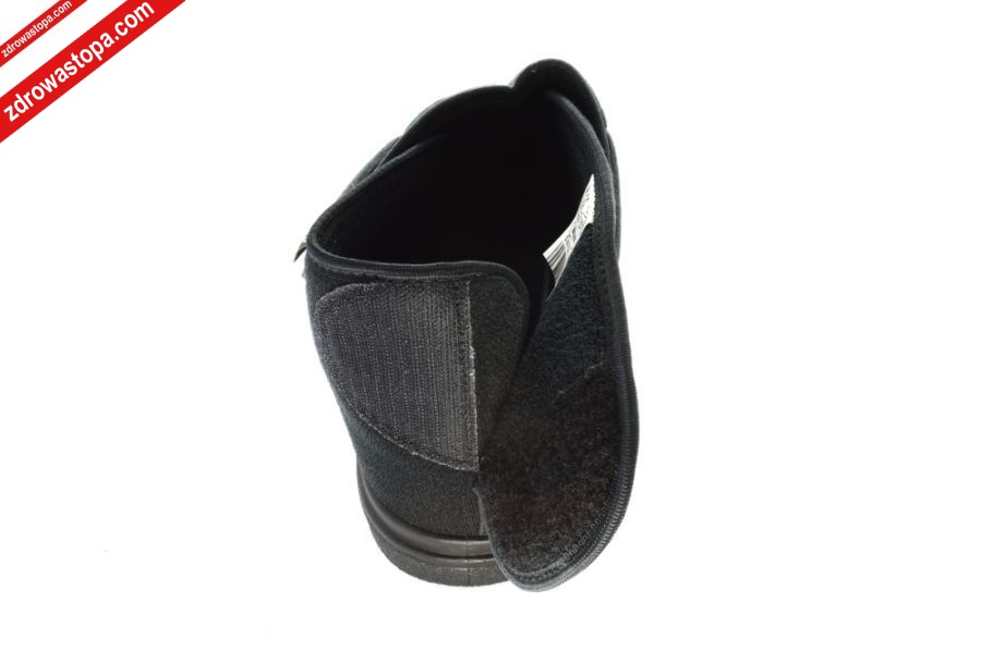 Typ: obuwie męskie Kolor: czarne Materiał wierzchni: tekstylny Wnętrze buta: naturalny materiał Dodatkowe informacje: obuwie tekstylne, materiał: microsidney-pianka-frotta wysokiej jakości, podwyższona tęgość (J) zapewnia odpowiednią przestrzeń w części palcowej, konstrukcja obuwia zapewnia łatwe jego wkładanie, minimalna ilość przeszyć i łączeń, dwie rzepy z przodu i jedna z tyłu pozwalają na optymalne dopasowanie do stopy (nawet tej obrzmiałej), lekka sprężysta podeszwa z pianki poliuretanowej pochłania mikro-wstrząsy, posiadają wyjmowaną wkładkę, znakomite na stopy wrażliwe, mogą być stosowane przez osoby z tzw. „zespołem stopy cukrzycowej”.