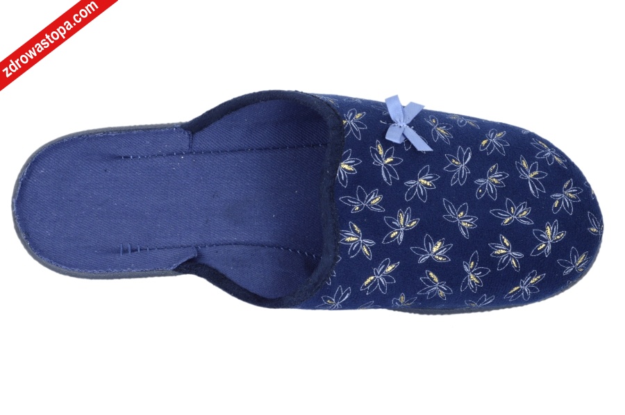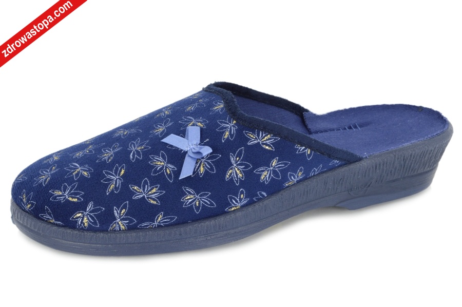 Typ: klapki damskie Kolor: granatowy Materiał wierzchni: naturalne tkaniny tekstylne Wnętrze buta: naturalne tkaniny tekstylne Dodatkowe informacje: Kolorystyka oraz aplikacje zgodne z najnowszymi trendami mody. Przeznaczone do użytku zarówno domowego jak i wyjściowego. Zastosowany na podeszwie system lekkiego i elastycznego PU sprawia, że podczas chodzenia amortyzowane są mikrowstrząsy, a dzięki odpowiedniej wysokości i wyprofilowaniu podeszwy utrzymana jest prawidłowa postawa ciała