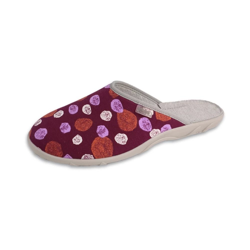 Typ: klapki damskie Kolor: bordowy Materiał wierzchni: naturalne tkaniny tekstylne Wnętrze buta: naturalne tkaniny tekstylne Dodatkowe informacje: Kolorystyka oraz aplikacje zgodne z najnowszymi trendami mody. Zastosowany na podeszwie system lekkiego i elastycznego PU sprawia, że podczas chodzenia amortyzowane są mikrowstrząsy, spody oddychające . Model z zakrytymi palcami.
