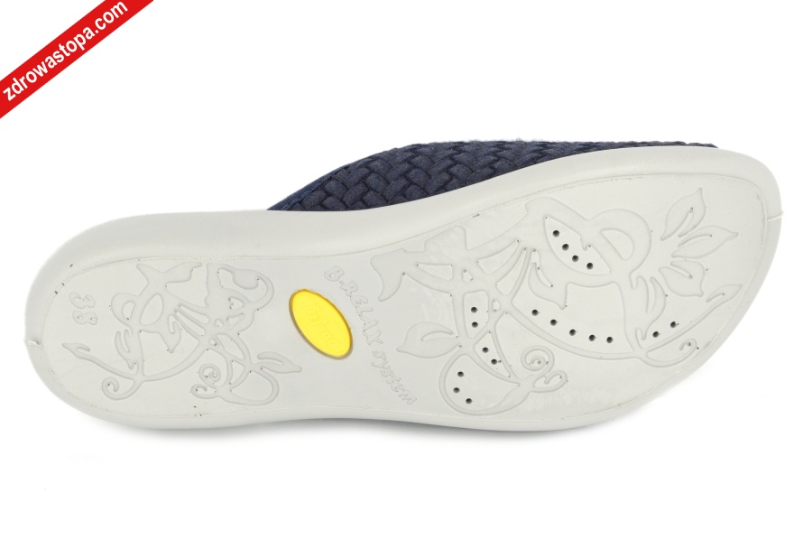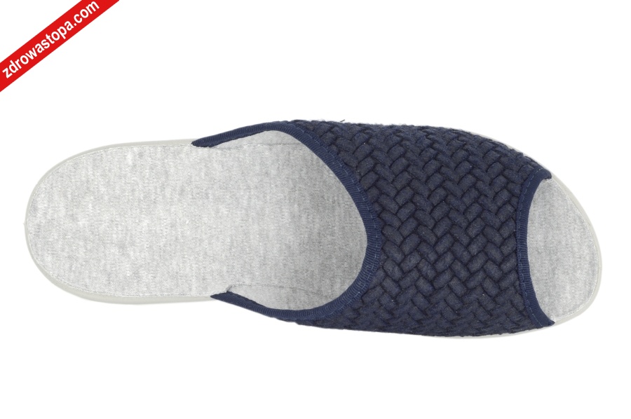 Typ: klapki damskie Kolor: granatowy Materiał wierzchni: naturalne tkaniny tekstylne Wnętrze buta: naturalne tkaniny tekstylne Dodatkowe informacje: Kolorystyka oraz aplikacje zgodne z najnowszymi trendami mody. Zastosowany na podeszwie system lekkiego i elastycznego PU sprawia, że podczas chodzenia amortyzowane są mikrowstrząsy, spody oddychające . Model z odkrytym palcem.