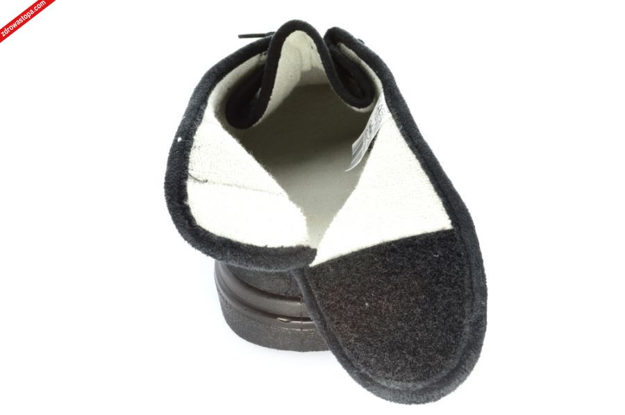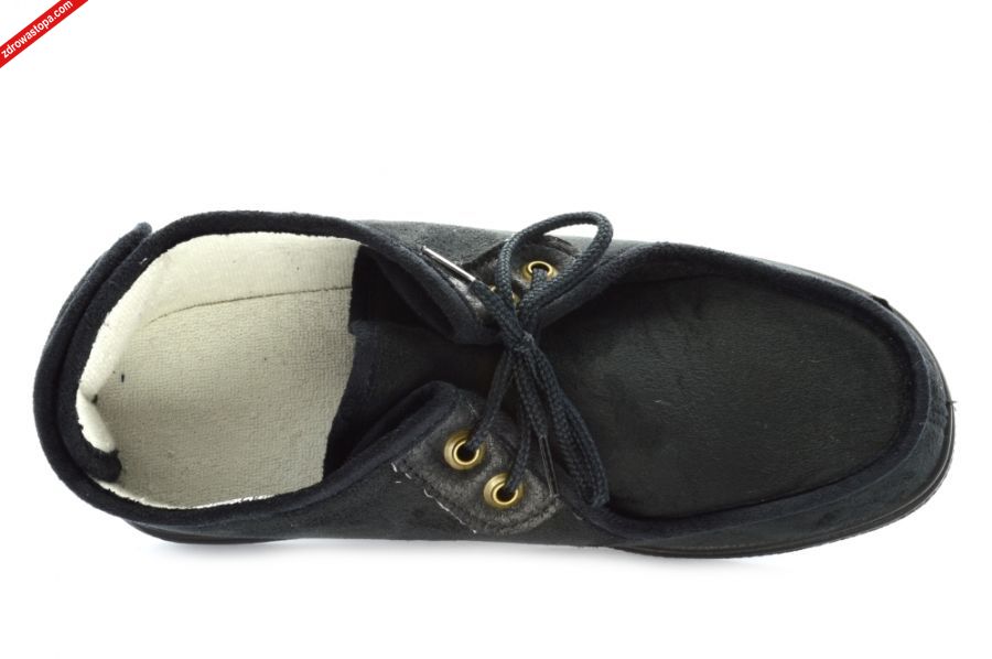 Typ: obuwie damskie Kolor: czarny Materiał wierzchni: materiał tekstylny Wnętrze buta: naturalny materiał Dodatkowe informacje: Obuwie tekstylne, materiał: microsidney-pianka-frotta wysokiej jakości, podwyższona tęgość (J) zapewnia odpowiednią przestrzeń w części palcowej, konstrukcja obuwia zapewnia łatwe jego wkładanie (rzep: z tyłu), minimalna ilość przeszyć i łączeń, zapięcie na rzep w tylnej części oraz sznurowadło z przodu pozwalają na optymalne dopasowanie do stopy (nawet tej obrzmiałej), lekka sprężysta podeszwa z pianki poliuretanowej pochłania mikro-wstrząsy, posiadają wkładkę, znakomite na stopy wrażliwe, mogą być stosowane przez osoby z tzw. „zespołem stopy cukrzycowej”.