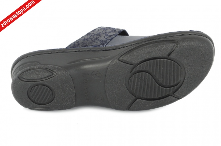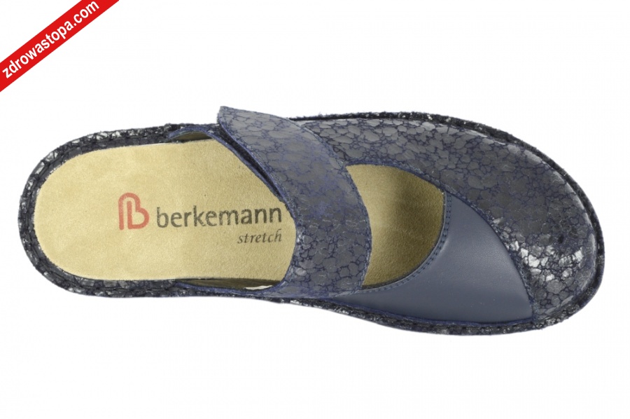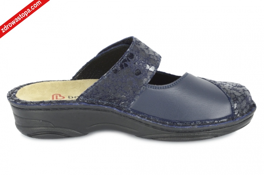 Typ: klapki damskie BERKOFLEX Kolor: granatowy Materiał wierzchni: skóra nubuk/stretch Wnętrze buta: skóra/materiał obuwniczy Tęgość: H Dodatkowe informacje:Jest to obuwie niemieckiej firmy BERKEMANN istniejącej od 1885 roku z linii BERKOFLEX. Posiadają bardzo dobrze wyprofilowane wkładki wymienne przystosowane do prania. Ponadto posiadają punkty na piętach amortyzujące mikrowstrząsy. Wyścielone skórą garbowania roślinnego. Oryginalna pięciofazowa wkładka w podeszwie wewnętrznej oraz zapięcie na rzepę zapewnia dobrą regulację. Sprawiają, że obuwie dobrze trzyma się na nodze i zapewnia najwyższy komfort noszenia. Dzięki wyjmowanej wkładce można stosować zamiennie wkładki ortopedyczne. Podeszwa lekka elastyczna nie ślizgająca się. Materiał wierzchni ze skóry nubukowej ze specjalnym elastycznym bardzo miękkim materiałem obuwniczym na wysokości haluksa (stretch). Co powoduję komfort chodzenia nawet przy dużych haluksach.