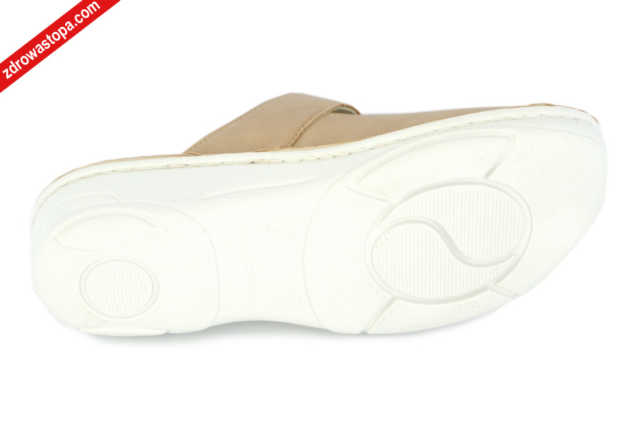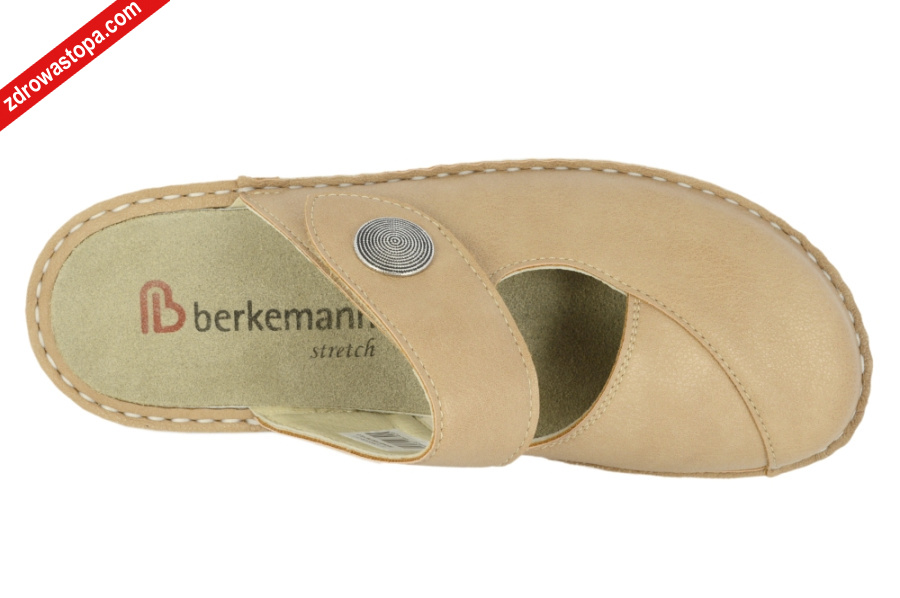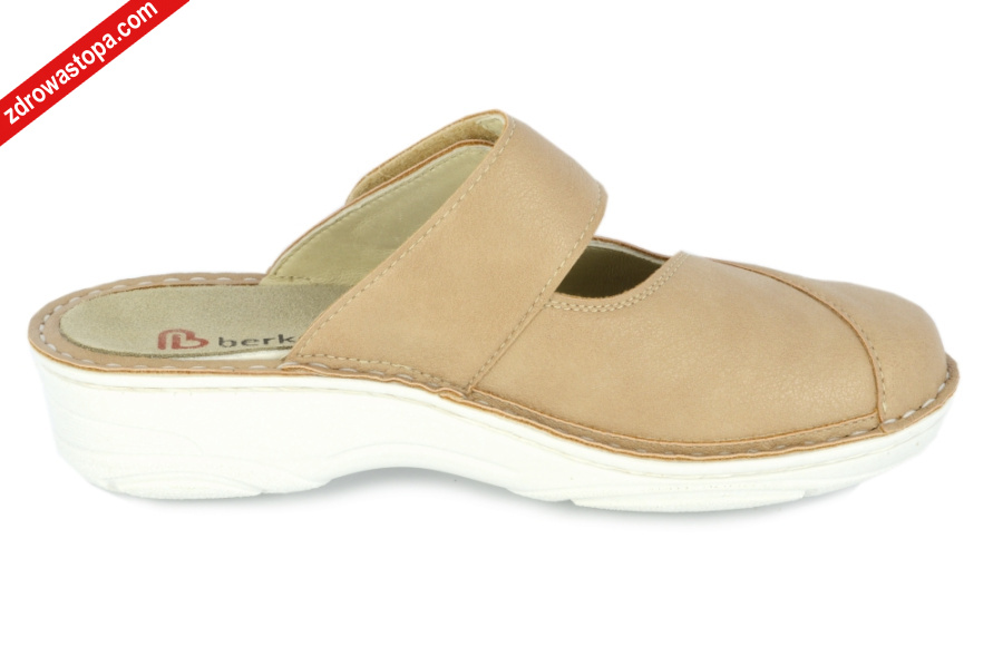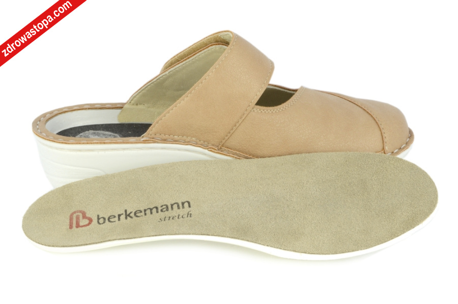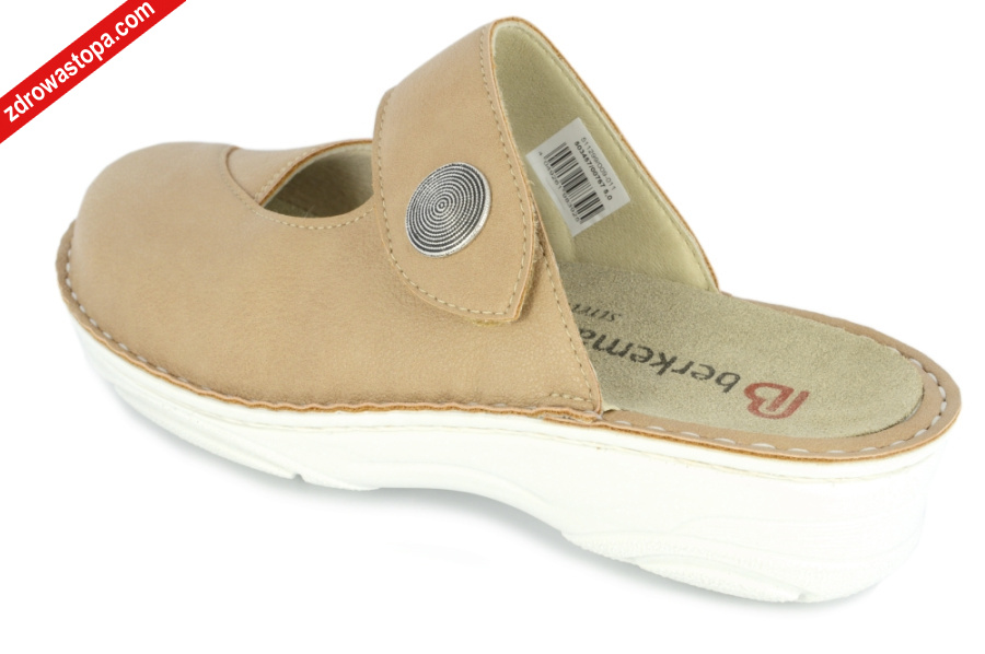Typ: klapki damskie BERKOFLEX Kolor: beżowy Materiał wierzchni: skóra nubuk/stretch Wnętrze buta: skóra/materiał obuwniczy Tęgość: H Dodatkowe informacje:Jest to obuwie niemieckiej firmy BERKEMANN istniejącej od 1885 roku z linii BERKOFLEX. Posiadają bardzo dobrze wyprofilowane wkładki wymienne przystosowane do prania. Ponadto posiadają punkty na piętach amortyzujące mikrowstrząsy. Wyścielone skórą garbowania roślinnego. Oryginalna pięciofazowa wkładka w podeszwie wewnętrznej oraz zapięcie na rzepę zapewnia dobrą regulację. Sprawiają, że obuwie dobrze trzyma się na nodze i zapewnia najwyższy komfort noszenia. Dzięki wyjmowanej wkładce można stosować zamiennie wkładki ortopedyczne. Podeszwa lekka elastyczna nie ślizgająca się. Materiał wierzchni ze skóry nubukowej ze specjalnym elastycznym bardzo miękkim materiałem obuwniczym na wysokości haluksa (stretch). Co powoduję komfort chodzenia nawet przy dużych haluksach.