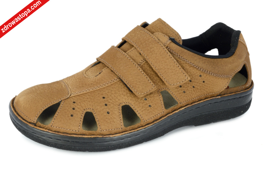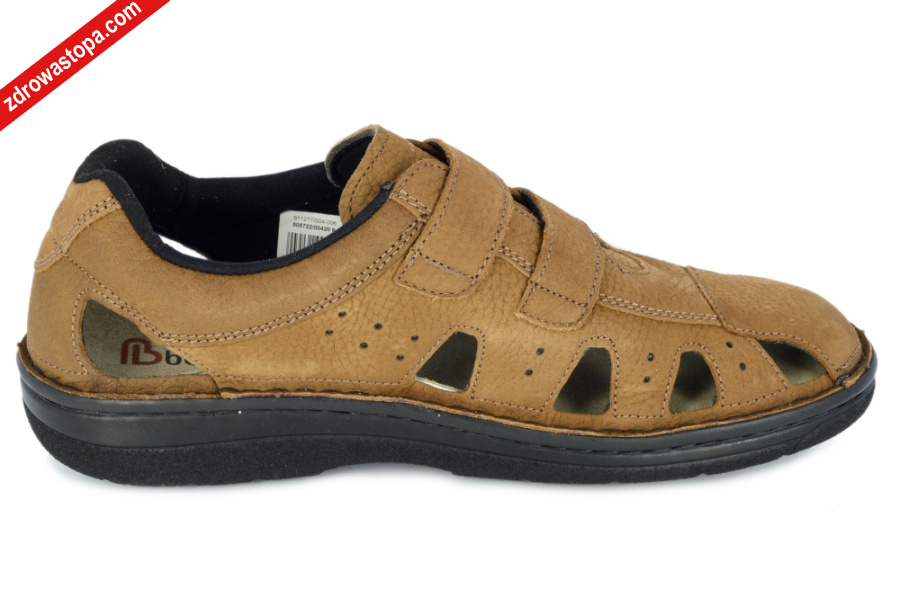 Typ: sandały męskie Kolor: brązowy – braun Tęgość: H Materiał wierzchni: skóra naturalna nubuk Wnętrze buta: materiał tekstylny, skórzana wyprofilowana i wyjmowana wkładka, Dodatkowe informacje: Jest to obuwie niemieckiej firmy BERKEMANN istniejącej od 1885 roku z linii BERKOFLEX. Posiadają bardzo dobrze wyprofilowane wkładki wymienne przystosowane do prania. Ponadto posiadają punkty na piętach amortyzujące mikro wstrząsy. Wyścielone skórą garbowania roślinnego. Oryginalna pięciofazowa wkładka w podeszwie wewnętrznej oraz zapięcia na 2 rzepy zapewniają wiele możliwości regulacji. Sprawiają, że obuwie dobrze trzyma się na nodze i zapewnia najwyższy komfort noszenia. Dzięki wyjmowanej wkładce można stosować zamiennie wkładki ortopedyczne. Podeszwa lekka elastyczna nie ślizgająca się.