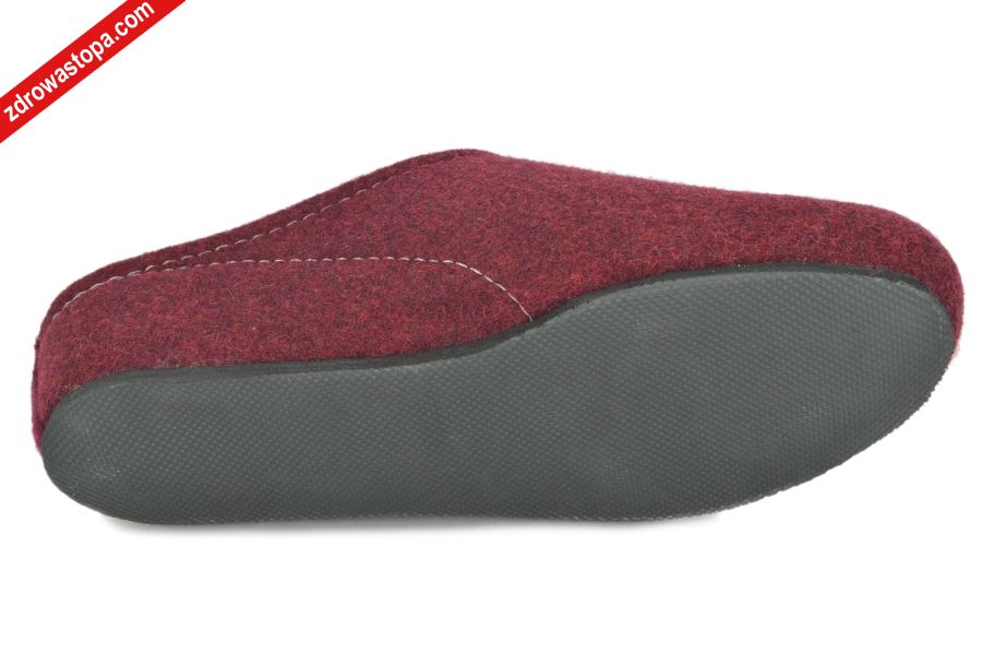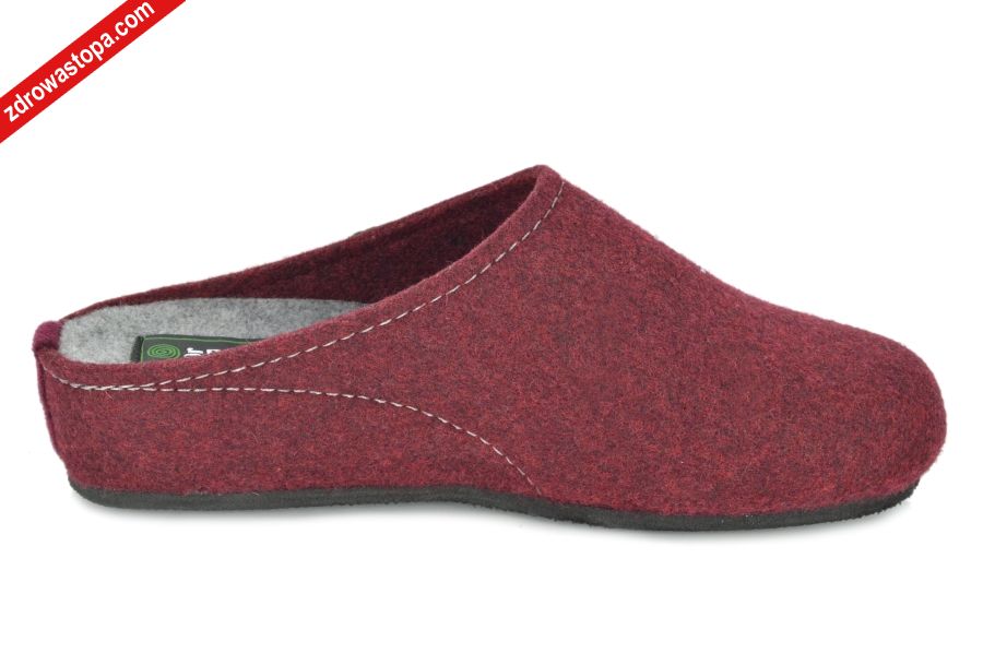 Typ: kapcie damskie Kolor: bordowy – bordeaux Materiał wierzchni/Wnętrze buta: wykonane z naturalnych materiałów 100% wełny Tęgość: H Dodatkowe informacje: W celu zadbania o prawidłowy kręgosłup, wysokość klinu wynosi 35 mm, bez zelówki. Bardzo wygodne, wkładka ortopedyczna wełniana. Wykonane z całej wełny (bez łączeń) nadają się dla stóp problematycznych (haluksy). Dzięki prawidłowemu ustawieniu stopy, użytkowanie ich przynosi wielką przyjemność np. ciepło.