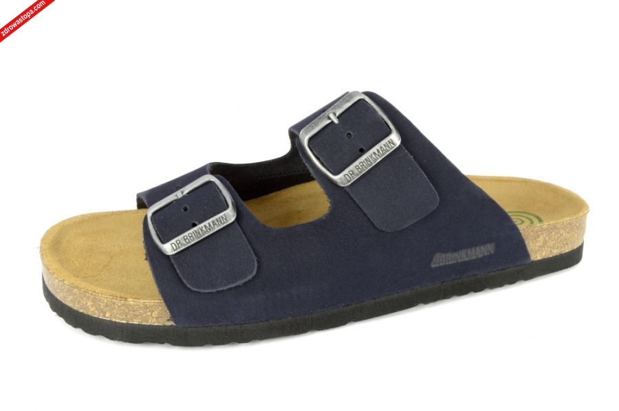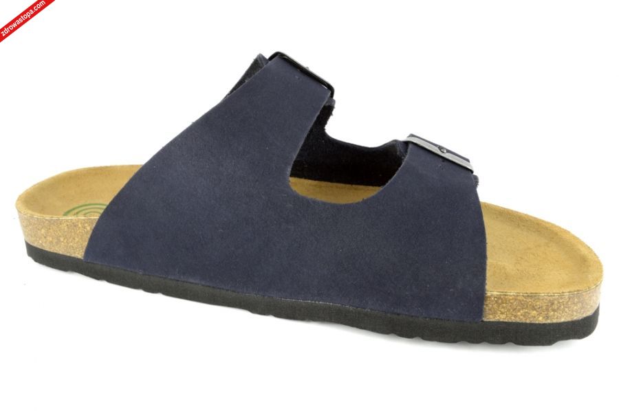 Typ: klapki Kolor: granatowy – blau Materiał wierzchni: skóra nubuk Wnętrze buta: całość ze skóry Wnętrze klapka: wyprofilowana wkładka skórzana na korku Dodatkowe informacje: cholewka skórzana, nubukowa, super wyprofilowane ortopedyczne klapki męskie, regulowane na dwa paski z klamerką.