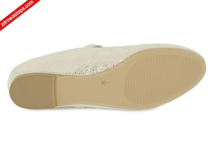 Typ: półbuty Kolor: złoty – lt gold Materiał wierzchni: skóra naturalna Wnętrze buta: skóra naturalna, wyjmowana wkładka Tęgość: G Dodatkowe informacje: Wykonane z bardzo miękkiej skóry. Zapięcie na pasek z klamerką. Wyjmowana wkładka miękka i pokryta skórą. Spody amortyzują mikrowstrząsy , lekkie, bardzo elastyczne i miękkie.