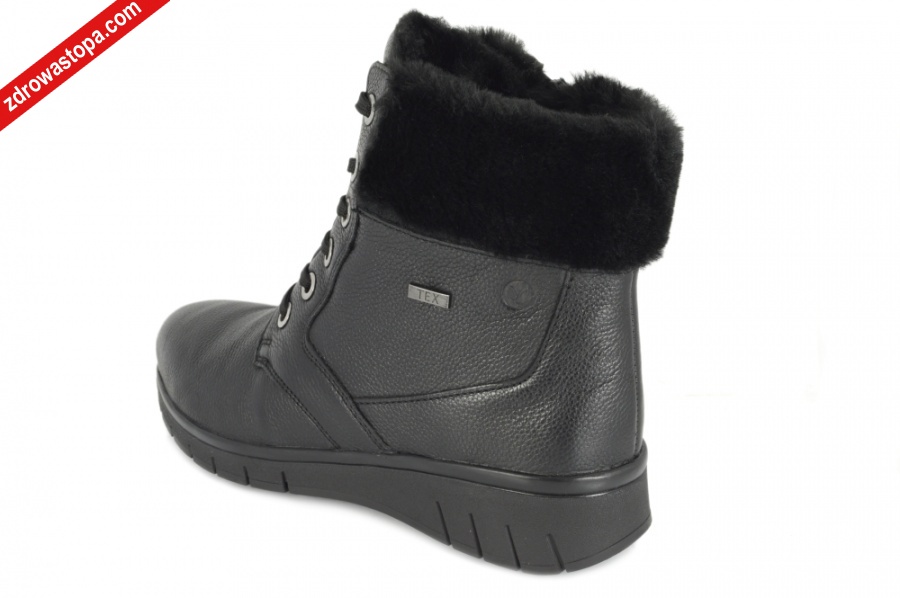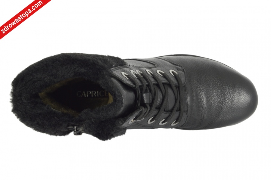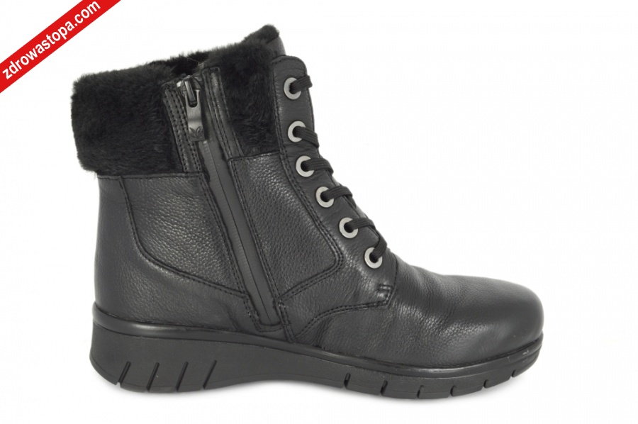 Typ: botki damskie Kolor: czarny – black nappa Materiał wierzchni: skóra naturalna z TEX Wnętrze buta: miękkie futerko Dodatkowe informacje: Obuwie sznurowane gwarantuje dobre dopasowanie, zakładanie ułatwia suwak z boku, bardzo miękka skóra, ocieplane naturalnym futerkiem. Wkładka posiada system ” onAIR ” bazuje na zaczerpniętej z natury konstrukcji plastra miodu, gwarantuje szybkie odprowadzenie wilgoci, przepływ wewnątrz obuwia oraz doskonałą amortyzacje, spody antypoślizgowe.