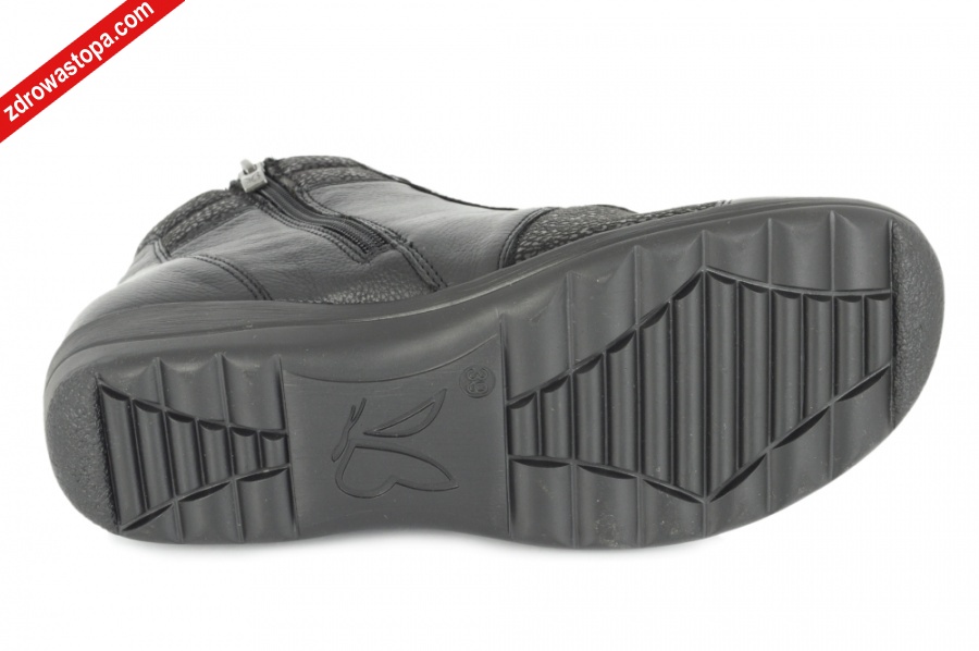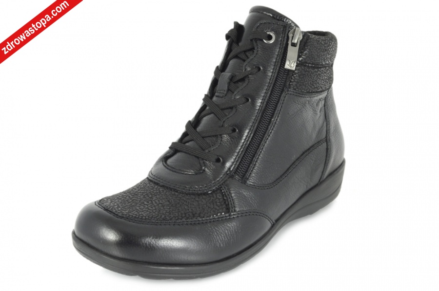 Typ: botki damskie Kolor: czarny – black comb Materiał wierzchni: miękka skóra naturalna i rozciągliwy materiał Wnętrze buta: wyjmowana wkładka, materiał obuwniczy Tęgość: H Dodatkowe informacje: Obuwie sznurowane pozwala na dobre dopasowanie do stopy, suwaki po bokach ułatwiają zakładanie. Wymiękczenie na wewnętrznej stronie chroni wrażliwe miejsca od obtarć i ucisku. Lekkie i elastyczne wykonane z bardzo miękkiej skóry. Wyjmowana wkładka posiada system ” onAIR ” bazuje na zaczerpniętej z natury konstrukcji plastra miodu, gwarantuje szybkie odprowadzenie wilgoci, przepływ wewnątrz obuwia oraz doskonałą amortyzacje.