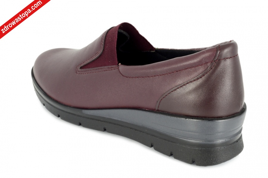 Typ: półbuty damskie Kolor: bordowy – bordeaux Materiał wierzchni: skóra naturalna licowa Wnętrze buta: wkładka skórzana i materiał obuwniczy Dodatkowe informacje: Obuwie wsuwane z gumką na podbiciu dopasowujące obuwie do stopy, wykonane ze skóry naturalnej, lekkie, posiadające wyjmowaną wkładkę, elastyczne spody amortyzują drgania.