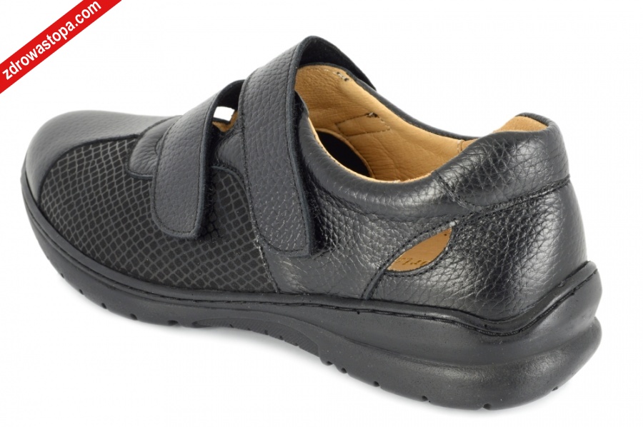 Typ: półbuty damskie Kolor: schwarz – czarny Materiał wierzchni: skóra naturalna i miękki materiał Wnętrze buta: wkładka skórzana i materiał obuwniczy Dodatkowe informacje: Obuwie zapinane na dwie rzepy, wykonane z miękkiej skóry naturalnej a w przedniej części z materiału który nie uciska na wrażliwe miejsca. Bardzo lekkie, posiadające wyjmowaną wkładkę, elastyczne spody i antypoślizgową podeszwę.
