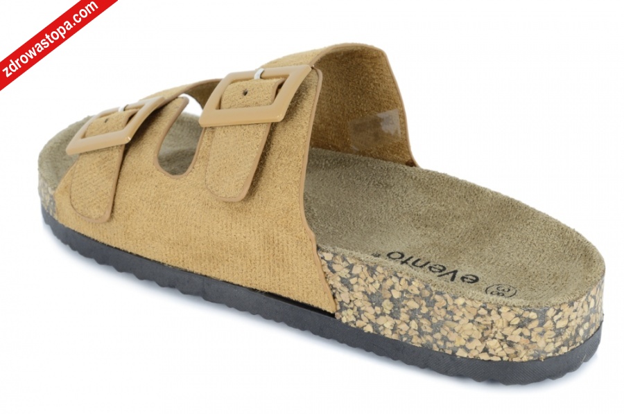 Typ: klapki Kolor: brązowy Materiał wierzchni: materiał ekologiczny Wnętrze buta: materiał ekologiczny Dodatkowe informacje: Wyprofilowane ortopedyczne klapki regulowane na dwa paski z klamerką.