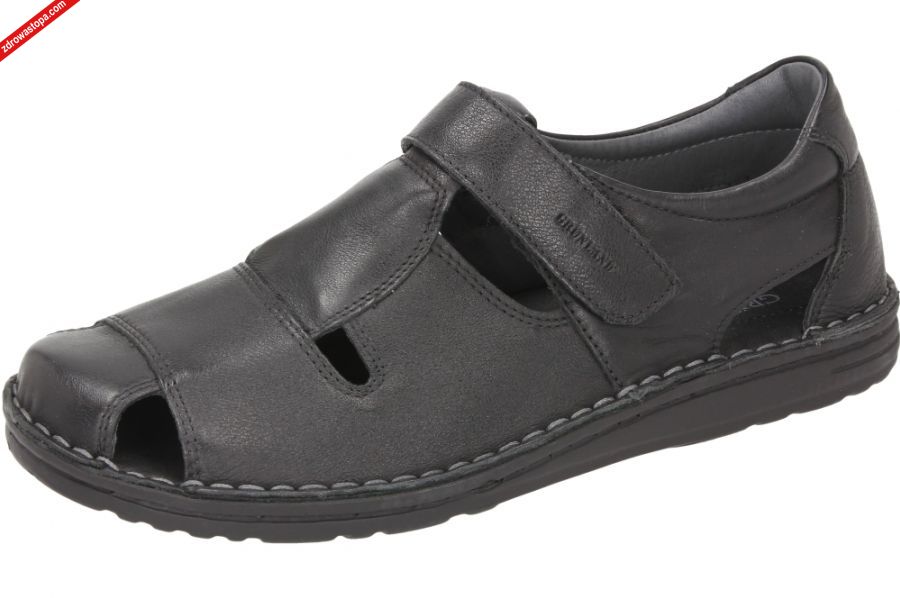 Typ: sandały męskie Kolor: czarny Materiał wierzchni: skóra lico Wnętrze buta: środek cały ze skóry Dodatkowe informacje: Sandały męskie z bardzo miękkiej skóry licowej, środek cały ze skóry, wymiękczona wkładka, zapięcie na rzepę. Obuwie bardzo lekkie z elastyczną podeszwą.