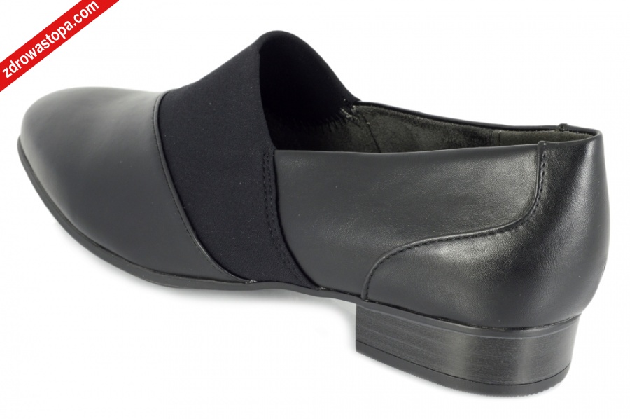 Typ: wsuwane damskie Kolor: czarny – black Materiał wierzchni: skóra ekologiczna rozciągliwy materiał tekstylny Wnętrze buta: naturalny materiał Tęgość: H Wysokość obcasa: 20 mm Dodatkowe informacje: wyłożone w środku naturalnym materiałem, bardzo wygodne i miękkie. Bardzo elastyczne i lekkie spody absorbujące drgania.