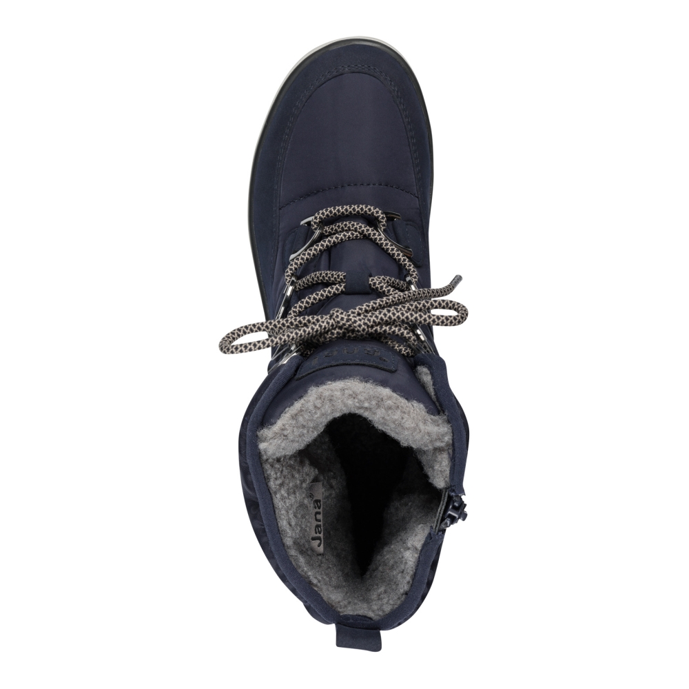 Typ: botki damskie Kolor: granatowy Materiał wierzchni: skóra ekologiczna i ortalion z JanaTex Wnętrze buta: wełna Tęgość: H Dodatkowe informacje: Bardzo wygodne w zakładaniu dzięki suwakowi z boku, idealne dopasowanie do stopy. Środek wykończona miękka wełną, wyjmowana wkładka. Spody elastyczne i antypoślizgowe. Obuwie jest bardzo lekkie i posiada membranę TEX uniemożliwiającą przemakanie butów