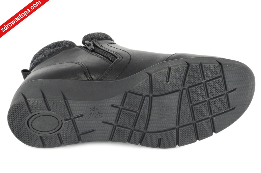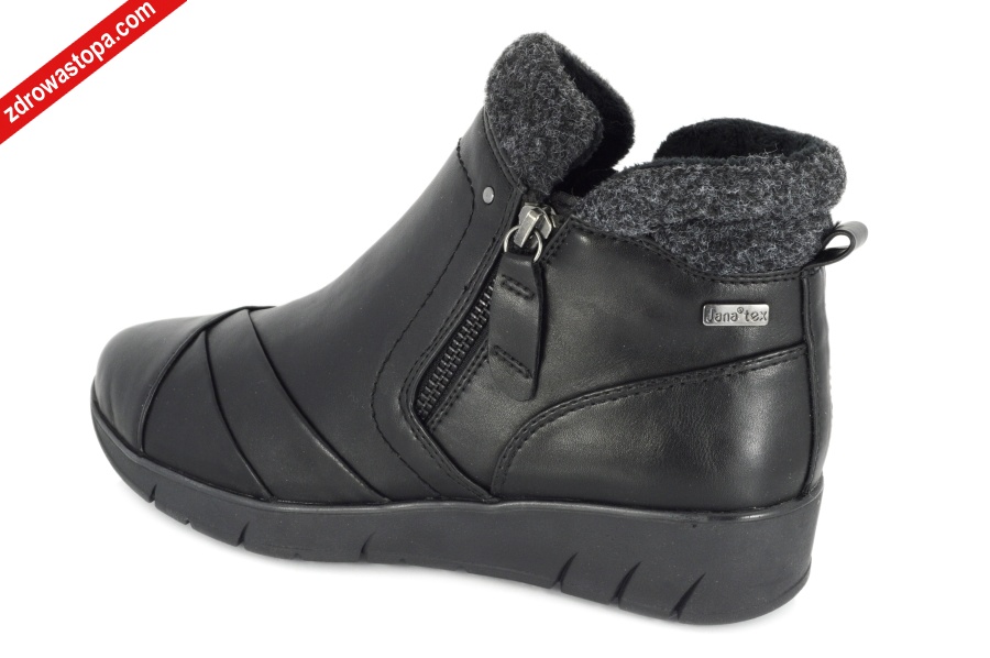Typ: botki damskie Kolor: czarny – black Materiał wierzchni: skóra ekologiczna z JanaTex Wnętrze buta: futerko syntetyczne Tęgość: H Dodatkowe informacje: Bardzo wygodne w zakładaniu. Zapinane na suwaki po bokach, idealne dopasowanie do stopy.. Środek wykończona cienkim, miękkim futerkiem, wyjmowana wkładka. Spody elastyczne i antypoślizgowe. Obuwie jest bardzo lekkie i posiada membranę TEX uniemożliwiającą przemakanie butów