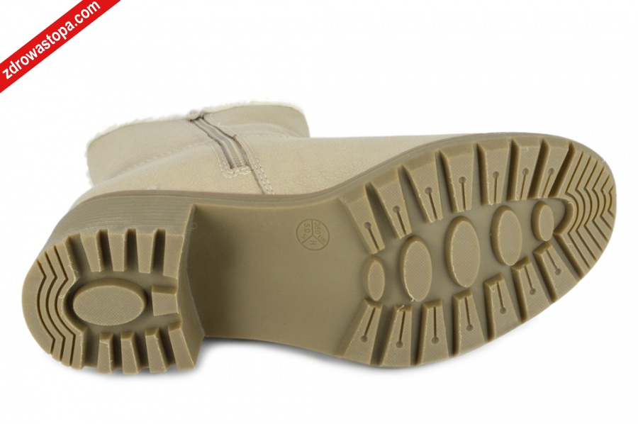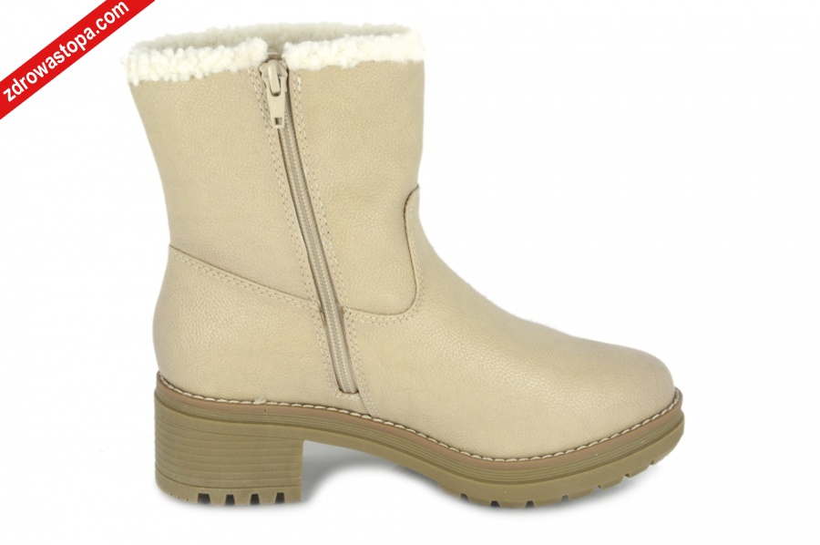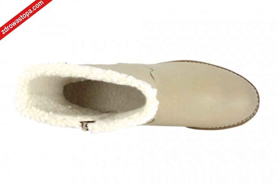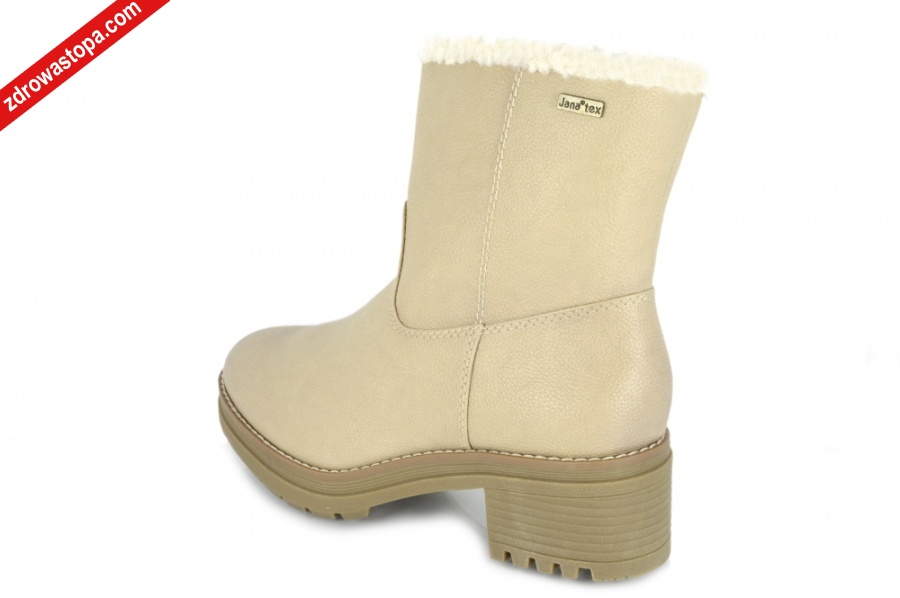 Typ: botki damskie Kolor: beżowy – ivory Materiał wierzchni: skóra ekologiczna z JanaTex Wnętrze buta: wełna Tęgość: H Dodatkowe informacje: Bardzo wygodne w zakładaniu dzięki suwakowi z boku. Środek wykończona miękka wełną, wyjmowana wkładka. Spody elastyczne i antypoślizgowe, wysokość obcasa 55mm. Obuwie jest bardzo lekkie i posiada membranę TEX uniemożliwiającą przemakanie butów