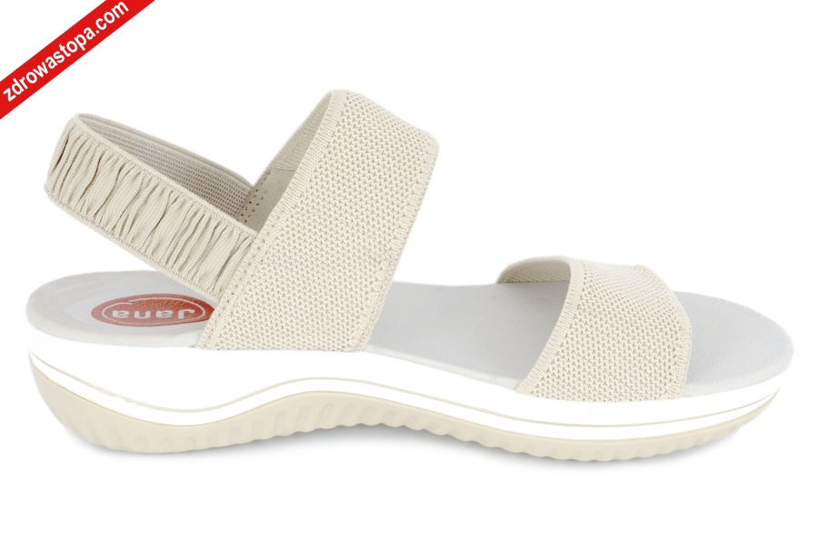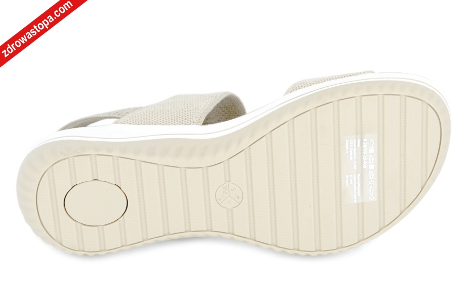 Typ: sandały damskie Kolor: beżowy – beige Materiał wierzchni: elastyczny materiał Wnętrze buta: elastyczny materiał Dodatkowe informacje: Regulowane przez elastyczną taśmę na pięcie. Miękka, piankowa wkładka. Bardzo elastyczne podeszwy, antypoślizgowe.