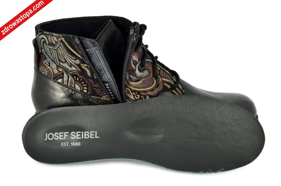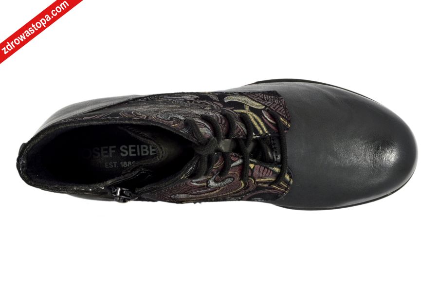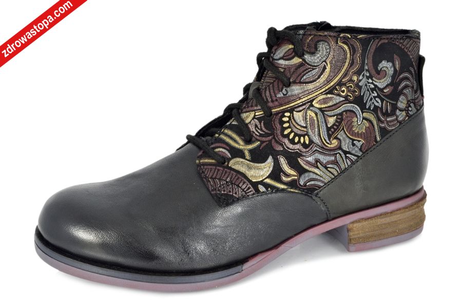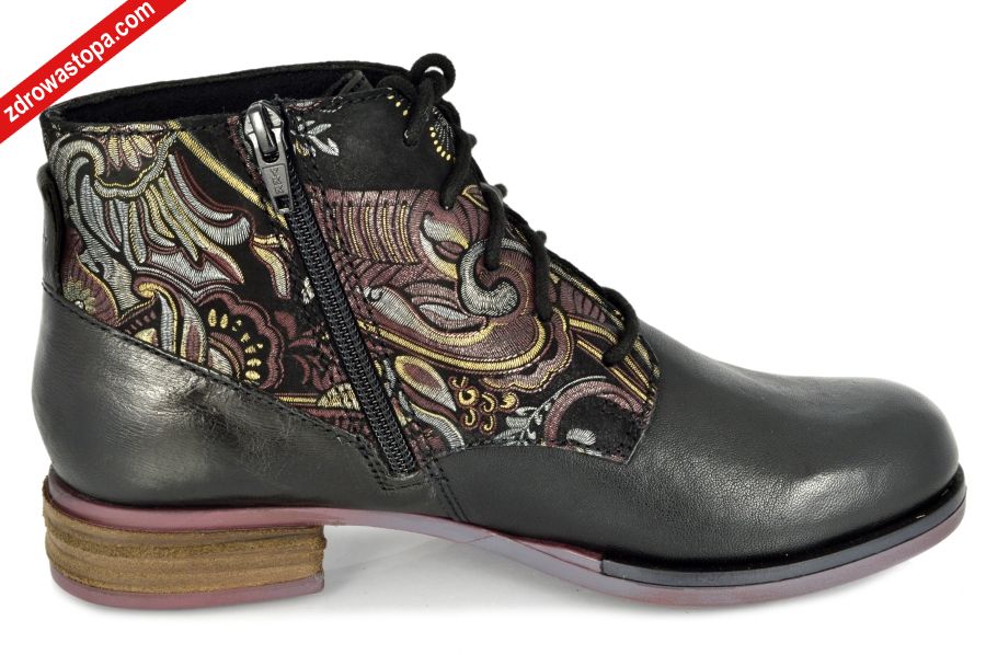 Typ: botki damskie Kolor: czarny – schwarz kombi Materiał wierzchni: naturalna skóra lico Wnętrze buta: ocieplone materiałem obuwniczym Tęgość: G Dodatkowe informacje: Łatwa wsuwalność dzięki zapięciu na suwak, sznurówki pozwalają na idealne dopasowanie do stopy. Bardzo miękka skóra, wysokość obcasu 30 mm. Wyjmowana miękka, skórzana wkładka. Spody lekkie i antypoślizgowe.