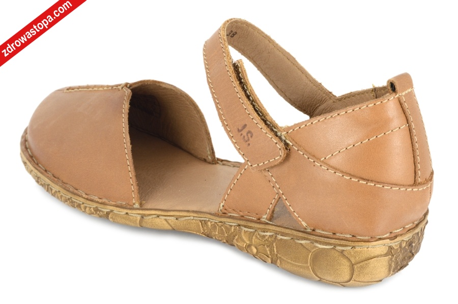 Typ: sandały damskie Kolor: brązowy – cognac Materiał wierzchni: skóra naturalna lico Wnętrze buta: skóra naturalna Dodatkowe informacje: zapięcie na pasek z rzepą, bardzo miękka skóra. Spody lekkie, bardzo elastyczne, antypoślizgowe.