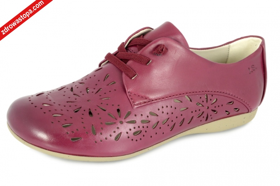 Typ: półbuty damskie Kolor: bordowy – berry Materiał wierzchni: skóra naturalna lico Wnętrze buta: skóra naturalna, wyjmowana wkładka skórzana Tęgość: G Dodatkowe informacje: bardzo lekkie i elastyczne, dziurki z przodu i boku dobrze wentylują wnętrze obuwia. Gumka elastycznie dopasowuje obuwie do stopy Miękka wkładka wykonana ze skóry.