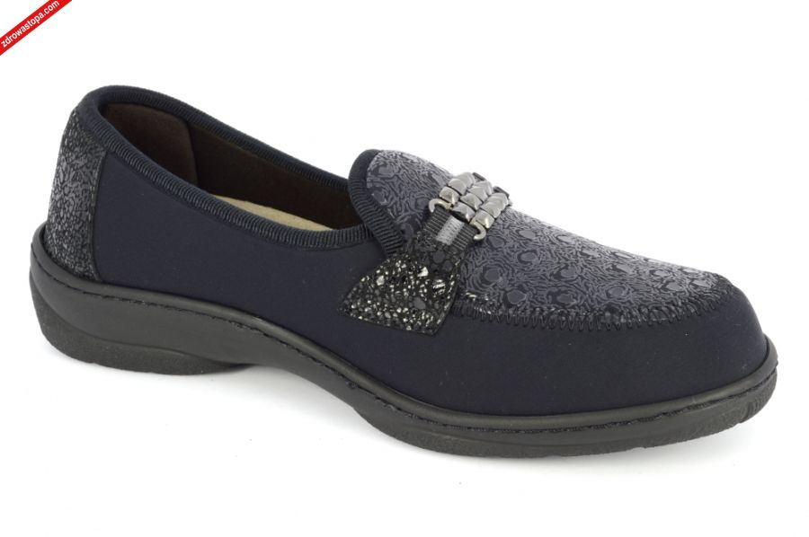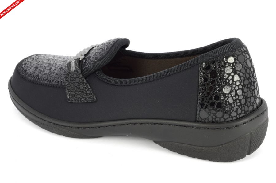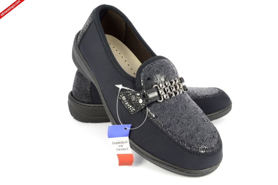 Typ: obuwie tekstylne damskie Kolor: noir – czarne Materiał wierzchni: obuwie tekstylne, materiał rozciągliwy – strecz – wysokiej jakości i pięta lakierowana Wnętrze buta: naturalny materiał Dodatkowe informacje: wyłożone w środku naturalnym materiałem, bardzo wygodne i miękkie. Wkładka skórzan wyjmowana, nadaje się do grubszych wkładek ortopedycznych.