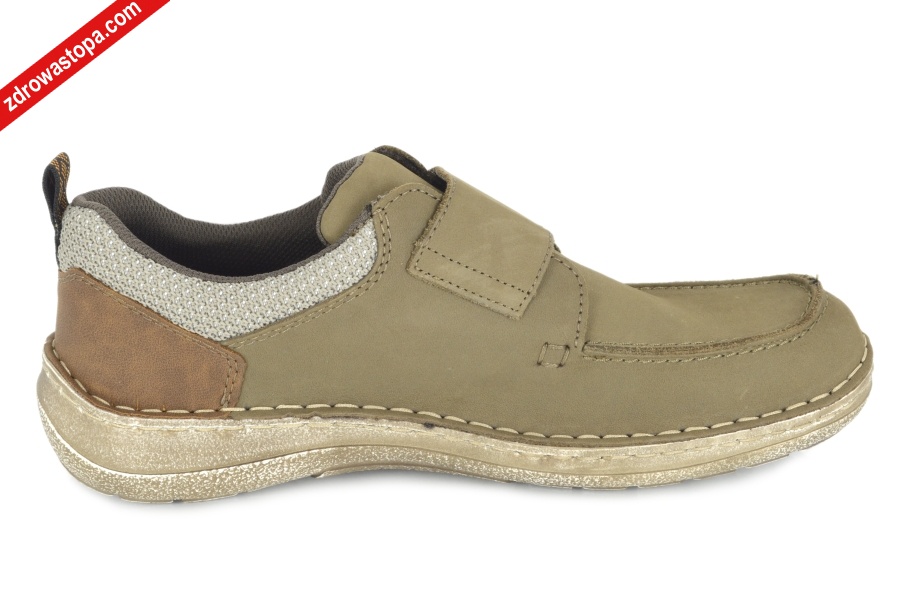 Typ: półbuty męskie Kolor: brązowy Materiał wierzchni: naturalna skóra nubuk Wnętrze buta: materiał obuwniczy Tęgość: H – EXTRA WEIT (extra tęgość) Dodatkowe informacje: Dobre dopasowanie do stopy zapewnia zapięcie na rzepę. Wykonane z bardzo miękkiej skóry. Wewnątrz wkładka wymiękczona. Spody lekkie, elastyczne, antypoślizgowe.