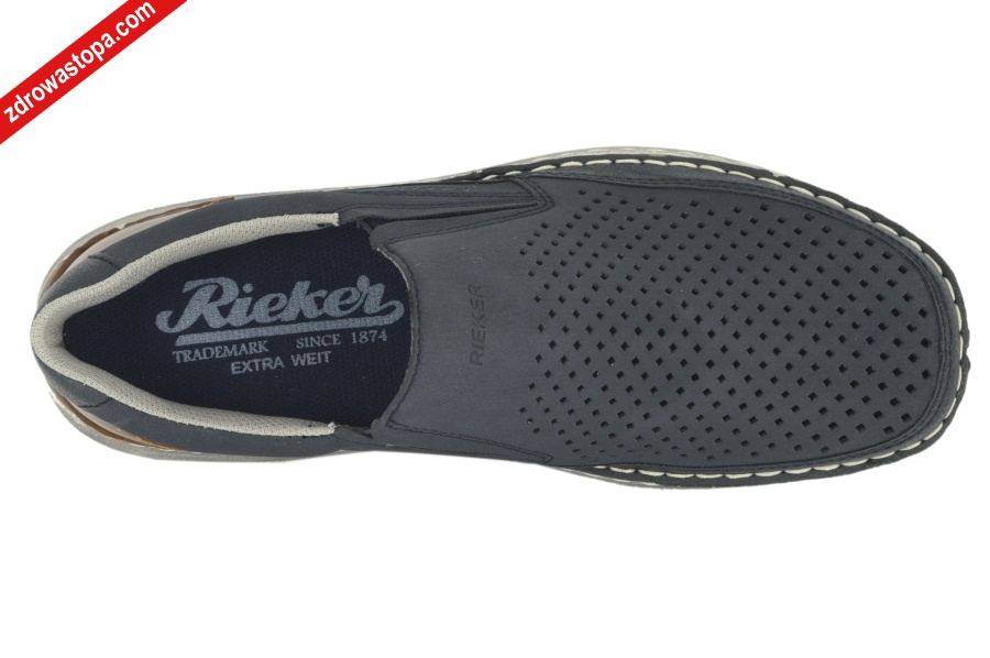 Typ: półbuty męskie Kolor: granatowy – blau Materiał wierzchni: skóra ekologiczna Wnętrze buta: materiał obuwniczy Dodatkowe informacje: obuwie męskie wsuwane, bardzo lekkie i elastyczne, dwie gumki po bokach ułatwiają wsuwanie obuwia oraz dobrze dopasowują się do podbicia, perforowane (dziurkowane) pozwala na dobrą wentylację wnętrza obuwia. Miękka wkładka