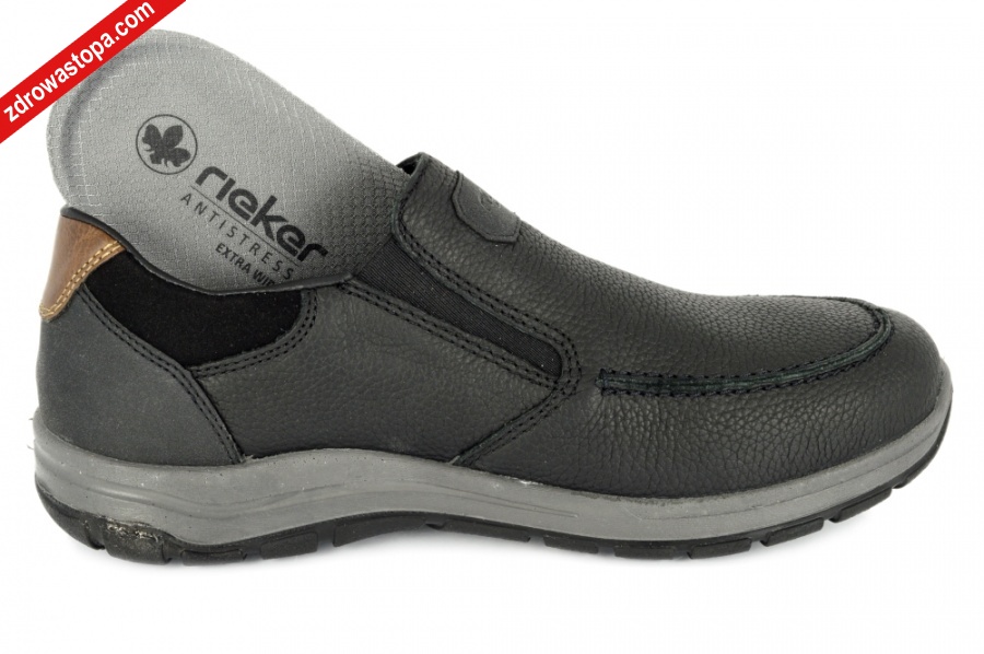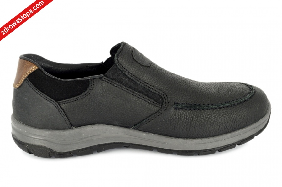 Typ: półbuty męskie Kolor: czarny – schwarz Tęgość: H Materiał wierzchni: naturalna skóra Wnętrze buta: skóra naturalna i miękka wyściółka Dodatkowe informacje: Obuwie wsuwane dobre dopasowanie zapewniają dwie gumki po bokach, bardzo elastyczne spody absorbujące drgania, antypoślizgowe. Miękka wyjmowana wkładka. Obuwie poszerzone w palcach nadające się na większą tęgość stopy.