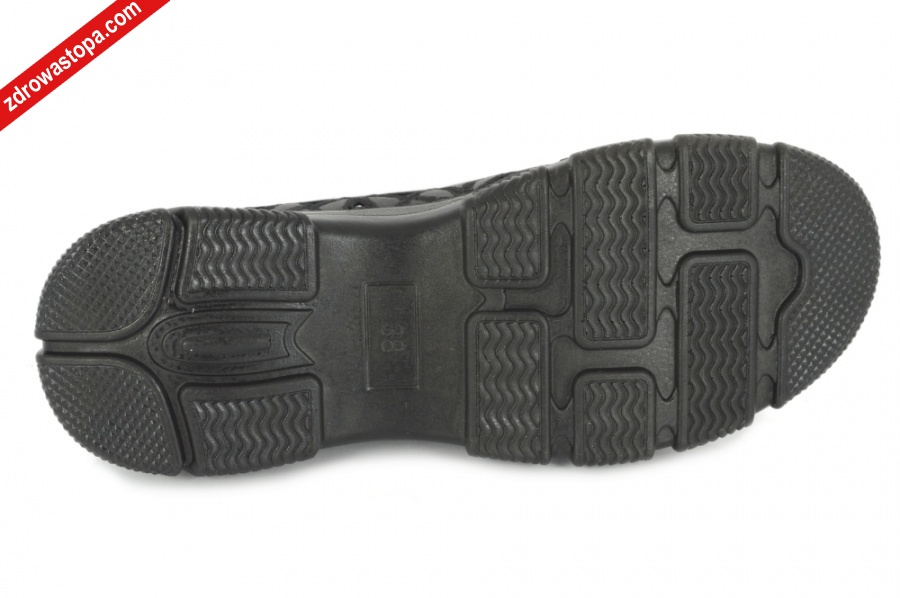 Typ: półbuty damskie Kolor: czarny Materiał wierzchni: skóra ekologiczna Wnętrze buta: skórzana wkładka, wyściółka skóra ekologiczna Dodatkowe informacje: Obuwie wsuwane, dwie gumki zapewniają dobre dopasowanie do stopy. Dzięki wycięciom są bardzo przewiewne. Spód lekki i elastyczny.