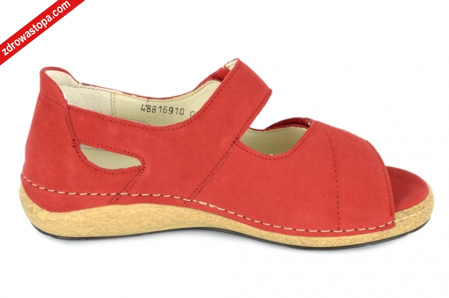 Typ: sandały damskie Kolor: czerwony – firmino Tęgość: K Materiał wierzchni: skóra naturalna nubuk Wnętrze buta: naturalny materiał, wyjmowana wkładka Dodatkowe informacje: sandały są wyjątkowo wygodne, bardzo dobre dopasowanie do stopy zapewniają dwie rzepy . Lekka antypoślizgowa podeszwa. Spełnią oczekiwania najbardziej wymagających odbiorców.