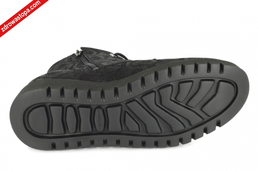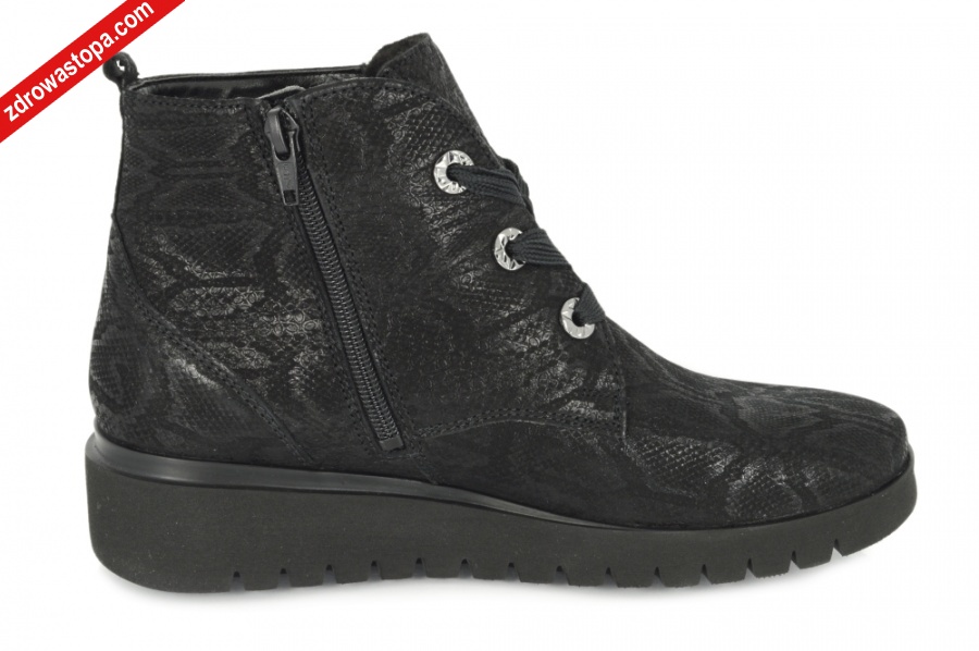 Typ: botki damski Kolor: czarne – schwarz Tęgość: H Materiał wierzchni: skóra naturalna w tłoczony wzór Wnętrze buta: skóra naturalna Dodatkowe informacje: wygodne, szerokie, wysokie w podbiciu i w palcach, sznurowane, suwak z boku ułatwiaja zakładanie. Minimalna ilość przeszyć i łączeń, lekka antypoślizgowa podeszwa. Profilowana wyjmowana wkładka, którą można zastąpić własną. Spełnią oczekiwania najbardziej wymagających odbiorców.