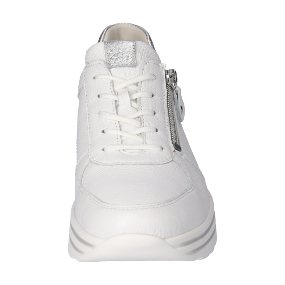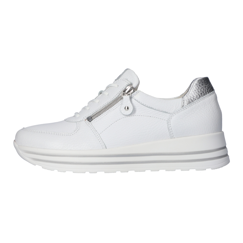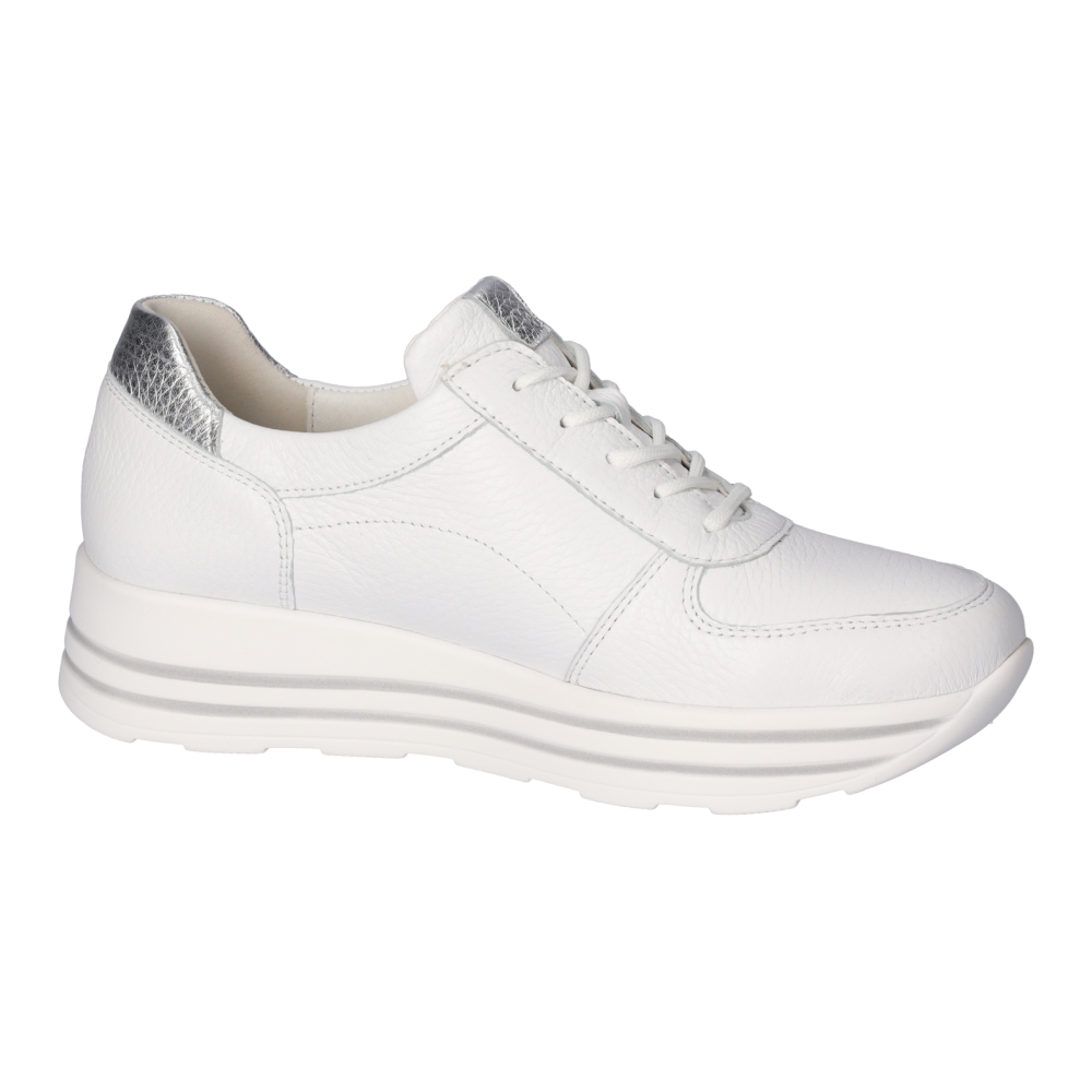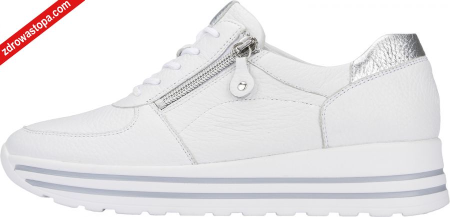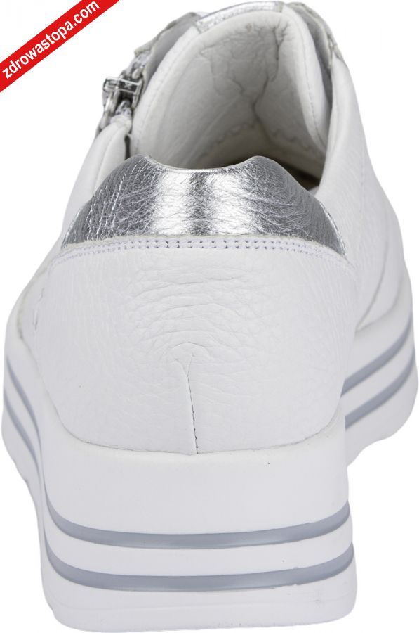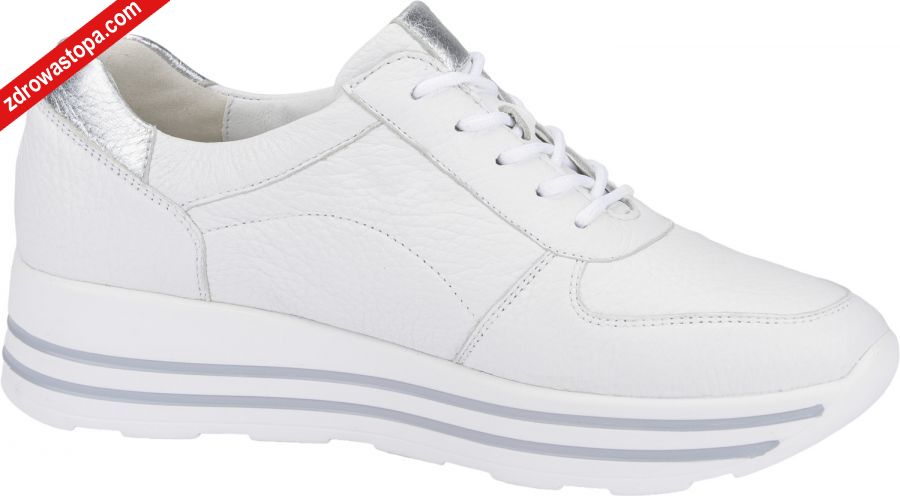 Typ: półbuty damskie Kolor: biały – weiss silber Materiał wierzchni: skóra naturalna Wnętrze buta: wyjmowana wkładka skórzana, Wysokość klinu: 40 mm Dodatkowe informacje: Wyjmowana wkładka daje możliwość wymiany na własną wkładkę ortopedyczną. Solidna antypoślizgowa podeszwa amortyzuje mikro-wstrząsy. Sznurówki pozwalają na idealne dopasowanie do stopy, suwak z boku umożliwia zakładanie bez rozsznurowywania. Obuwie lekkie i elastyczne.