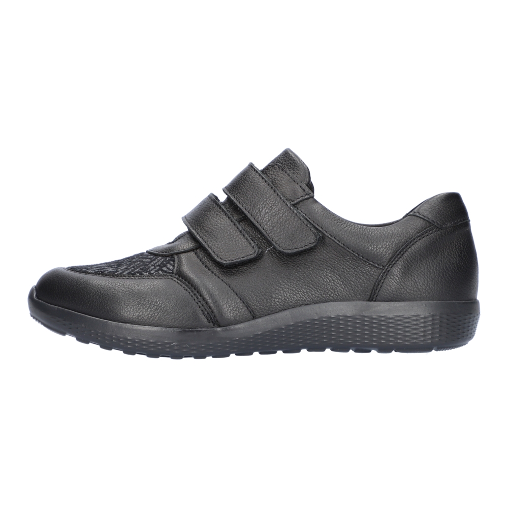 Typ: półbuty damskie Kolor: czarny Materiał wierzchni: skóra naturalna i rozciągliwy materiał Wnętrze buta: wyjmowana wkładka Wysokość klinu: 30 mm Dodatkowe informacje: Wyjmowana wkładka daje możliwość wymiany na własną wkładkę ortopedyczną, przednia część wykonana z rozciągliwego materiału dopasowującego się do stopy. Solidna antypoślizgowa podeszwa amortyzuje mikro-wstrząsy. Zapięcie na dwie rzepy. Obuwie lekkie i elastyczne.